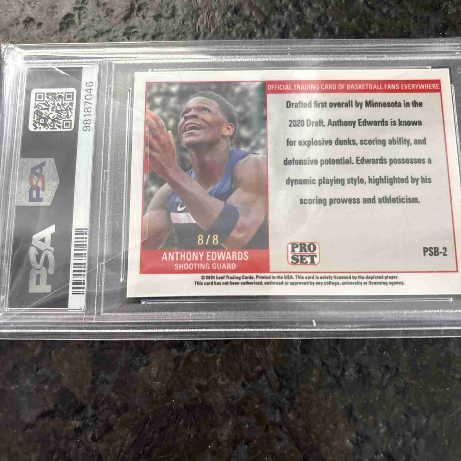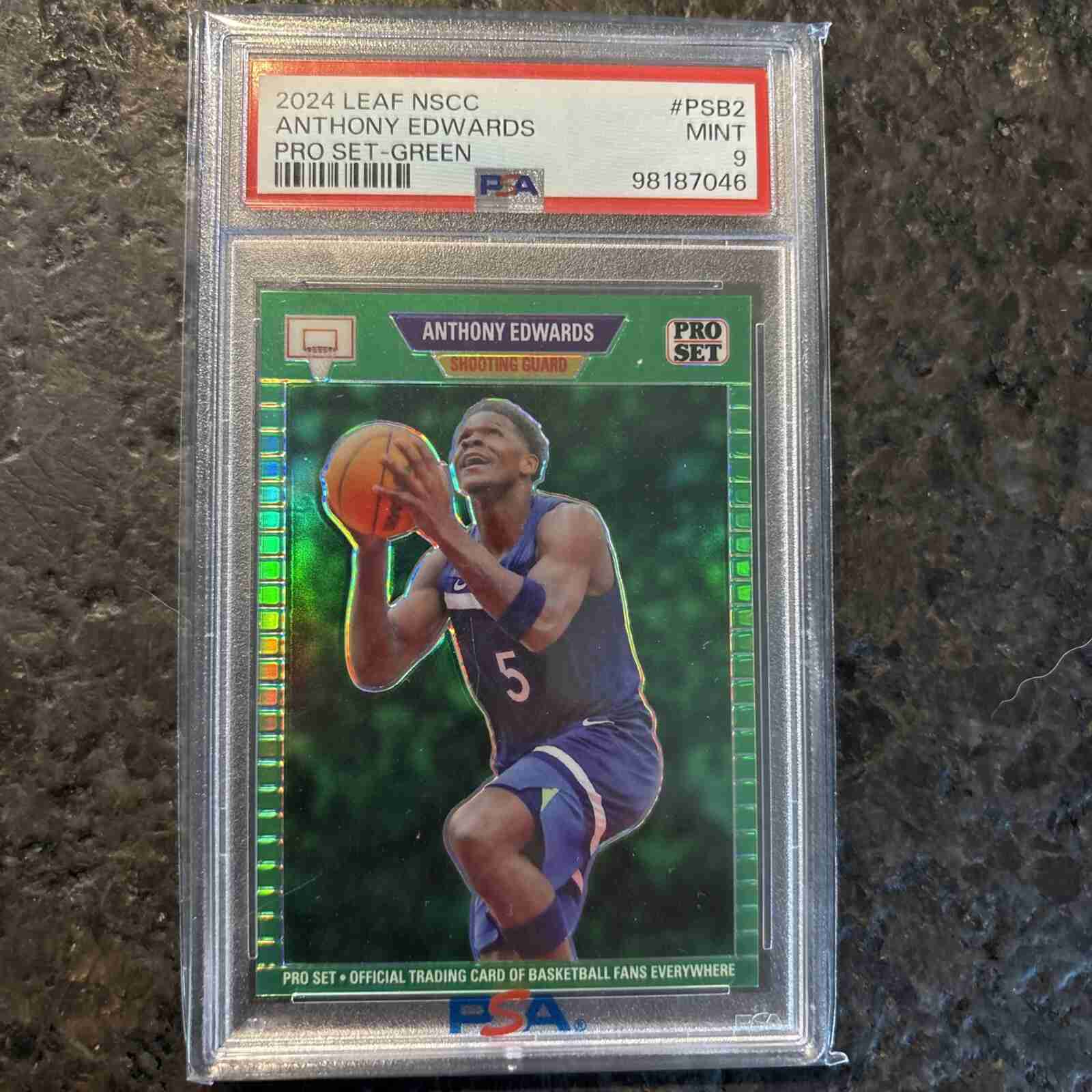 The product is a 2024 Leaf Metal Anthony Edwards Pro Set National Exclusive NSCC trading card. This basketball sports trading card features a limited print run of only 8, with each card serial numbered. The card is graded a 9 by Professional Sports Authenticator (PSA) and is part of the original 2024 Pro Set set. The card showcases Anthony Edwards from the Minnesota Timberwolves in the National Basketball Association (NBA) and is made of metal material, with a green parallel variety. This collectible item is a must-have for any basketball card enthusiast.