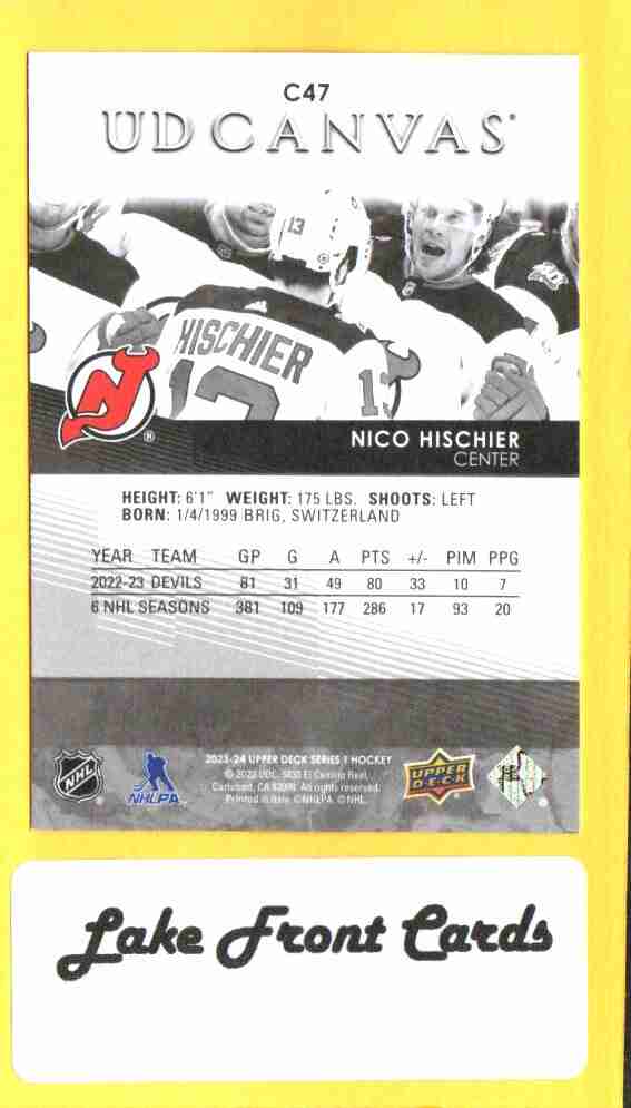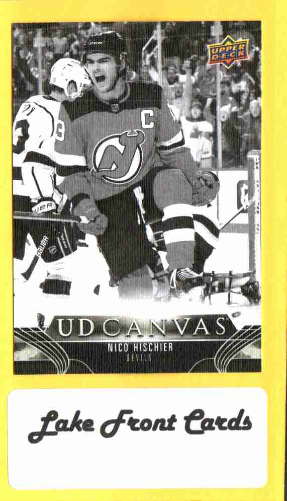 2023 Upper Deck UD Canvas Nico Hischier #C47 Black & White parallel featuring the New Jersey Devils captain. Stylish short-print Canvas design with the black-and-white finish, popular among modern NHL and Devils collectors. Card shown is the exact card you’ll receive.