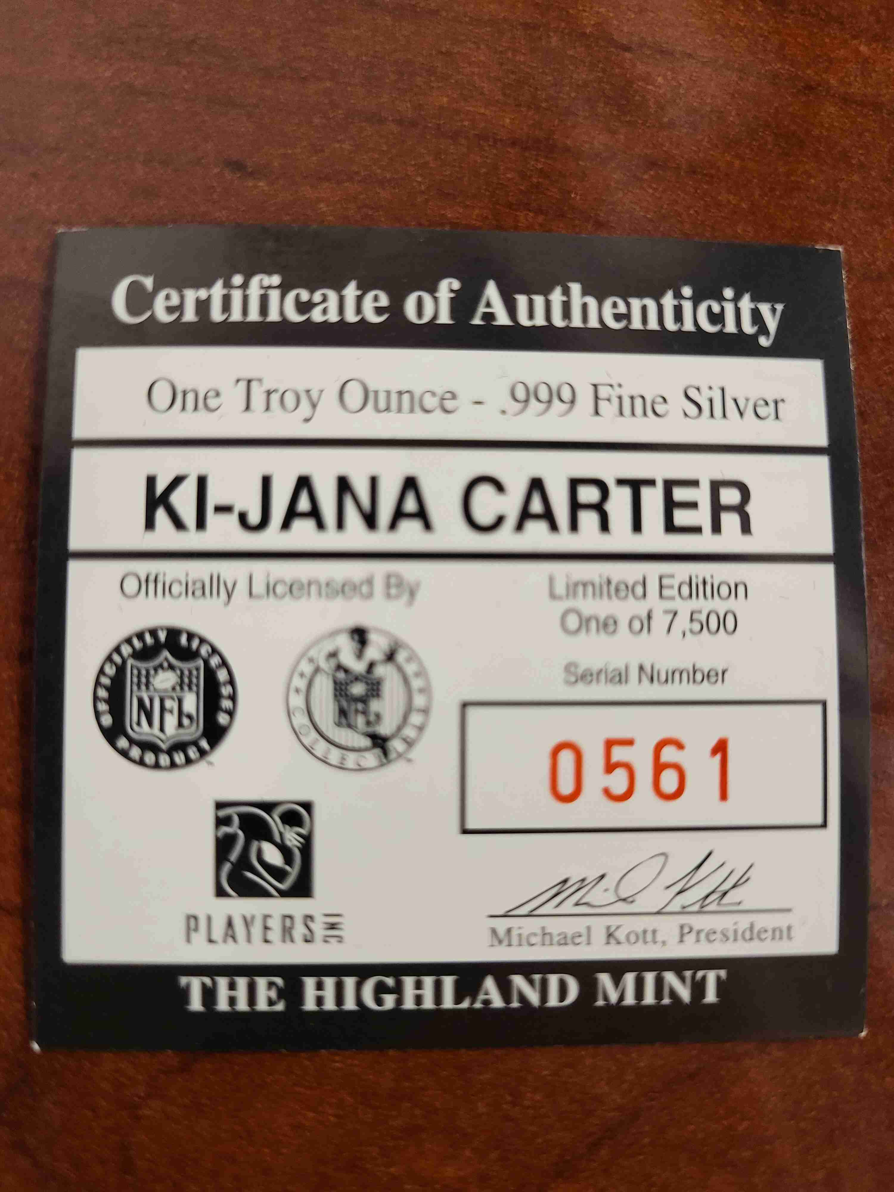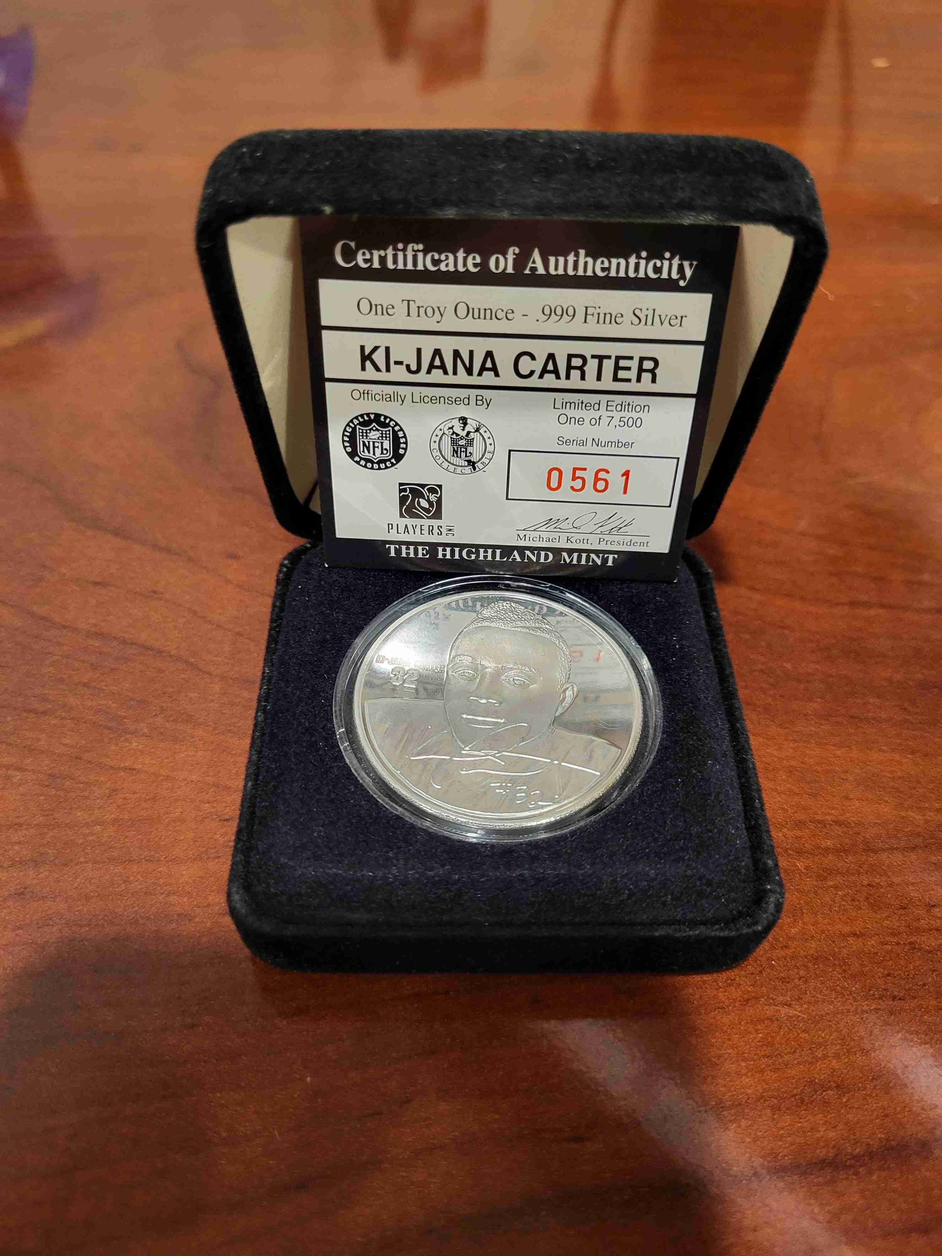 Ki-Jana Carter 1oz Silver Medallion .999 Fine Silver issued by The Highland Mint. As of listing, current silver value is $63.83/oz and climbing like crazy lately.