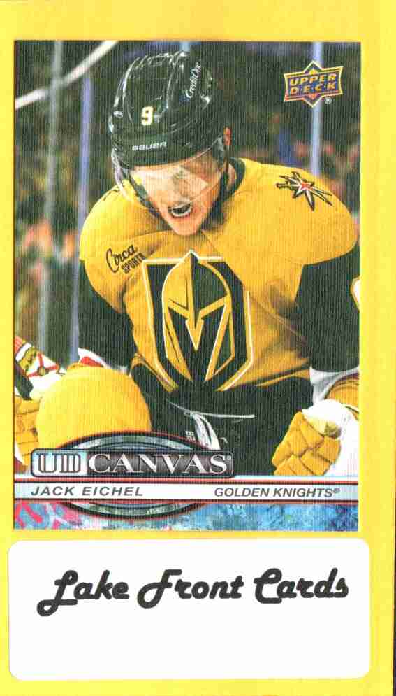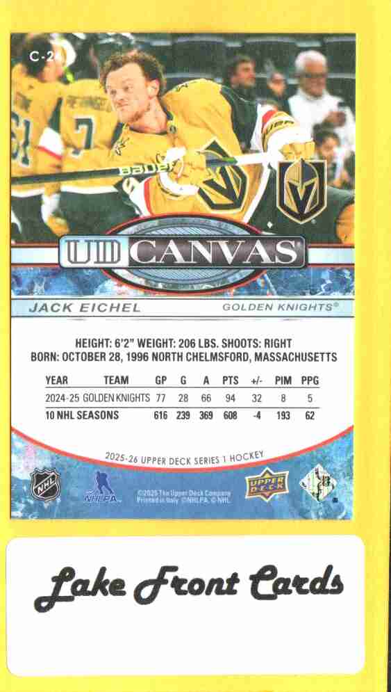 2025 Upper Deck UD Canvas Jack Eichel #C-24 card featuring the Vegas Golden Knights star center. Classic Canvas design highlighting one of the NHL’s elite forwards and a great addition for Golden Knights and Eichel collectors. Card shown is the exact card you’ll receive.