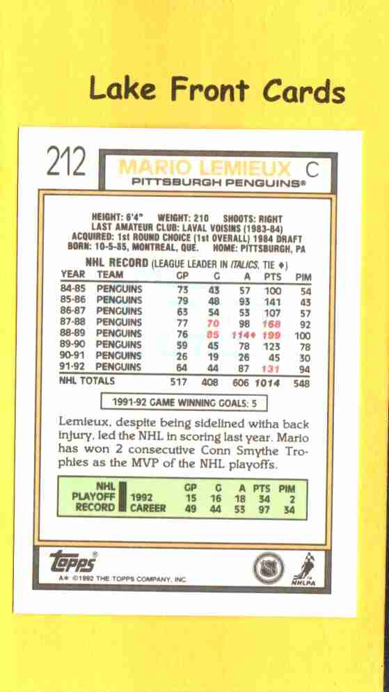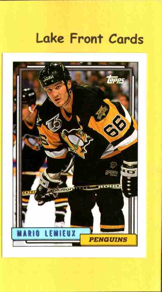 1992 Topps Mario Lemieux #212 card featuring the Pittsburgh Penguins legend and Hall of Famer. Classic early-’90s Topps issue showcasing one of the greatest players in NHL history. A must-have for Penguins and Lemieux collectors. Card shown is the exact card you’ll receive.