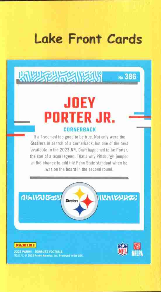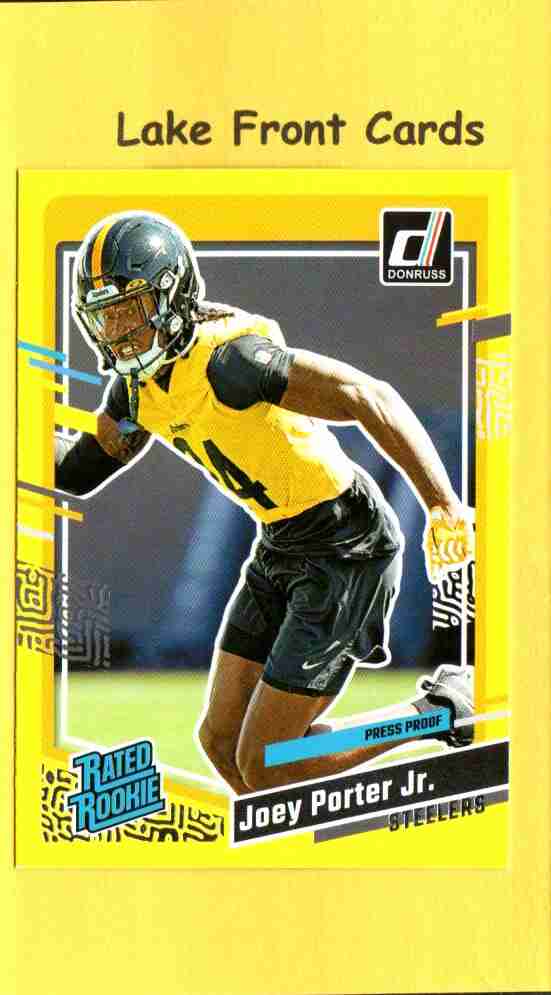 2023 Panini Donruss Joey Porter Jr. #386 Press Proof Yellow featuring the Pittsburgh Steelers rookie cornerback. Eye-catching yellow parallel from the Donruss set, popular with Steelers fans and modern NFL card collectors. Card shown is the exact card you’ll receive.