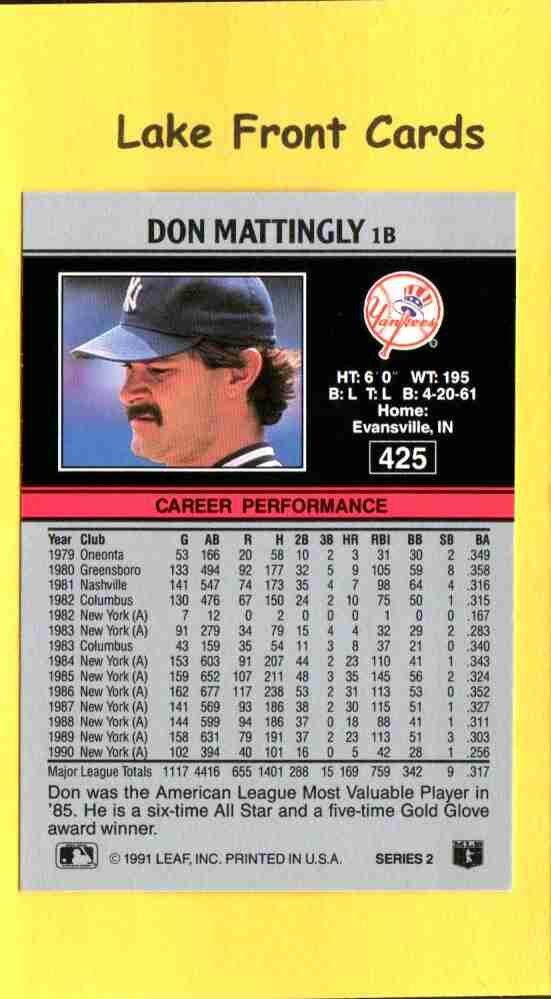 1991 Leaf Don Mattingly #425 card featuring the New York Yankees legend. Classic early-’90s Leaf issue showcasing one of the most popular Yankees of his era and a great addition for Yankees and Mattingly collectors. Card shown is the exact card you’ll receive.