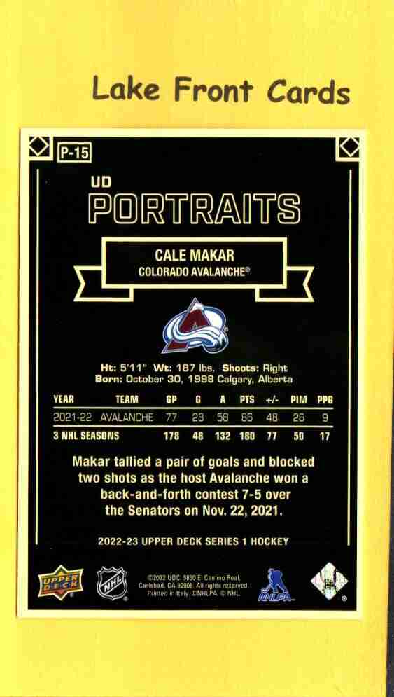 2022 Upper Deck UD Portraits Cale Makar #P-15 card featuring the Colorado Avalanche superstar defenseman. Clean Portraits insert design highlighting one of the NHL’s elite blueliners and a great addition for Avalanche and Makar collectors. Card shown is the exact card you’ll receive.
