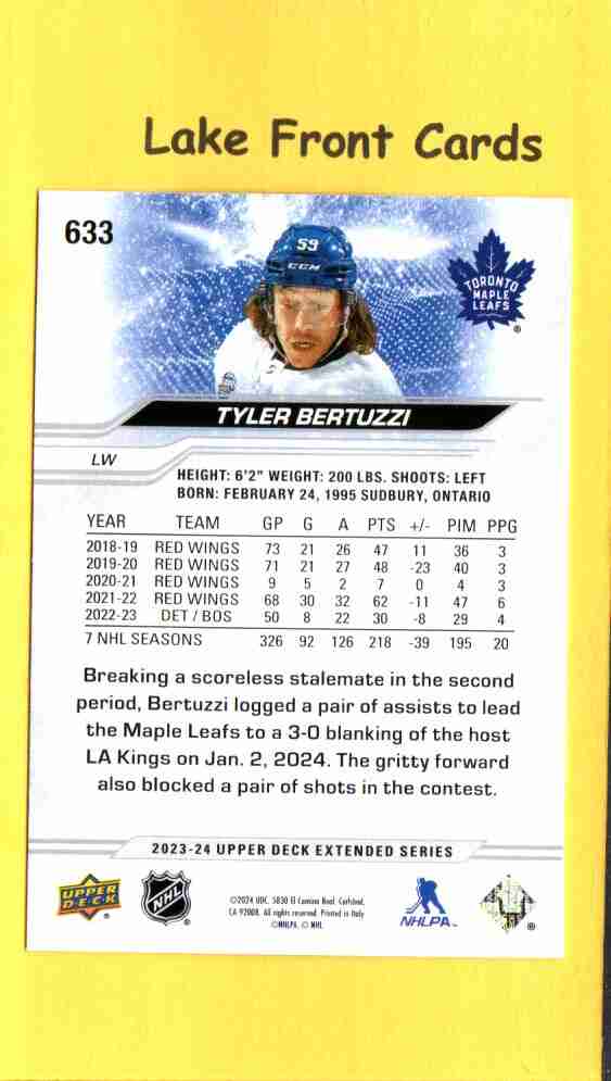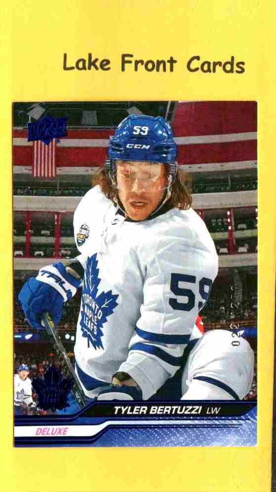 2023 Upper Deck Tyler Bertuzzi #633 Deluxe parallel, serial numbered 22/250. Limited-print Deluxe version with a premium finish, making it a strong collectible for Bertuzzi fans and modern NHL card collectors. Card shown is the exact card you’ll receive.
