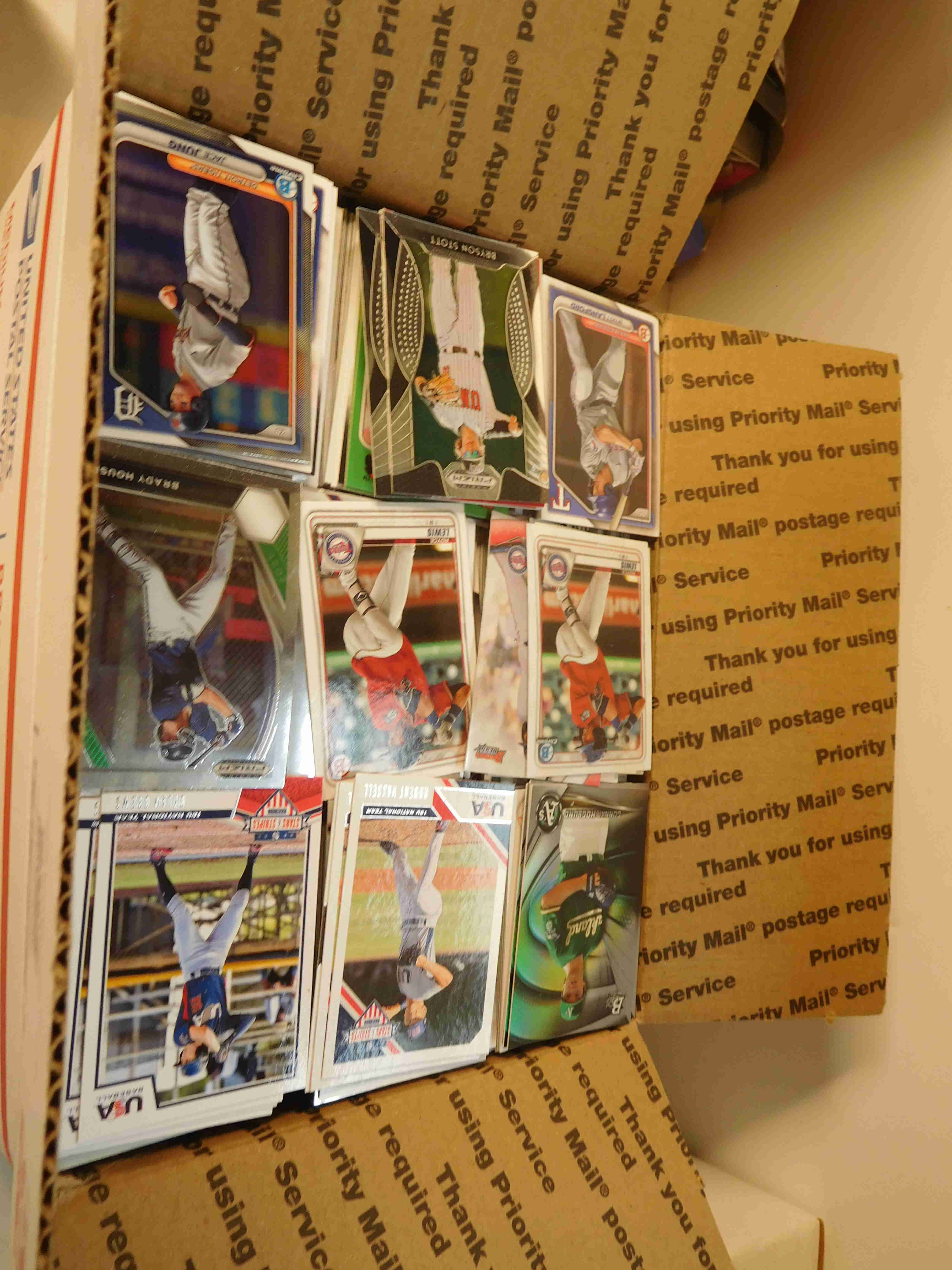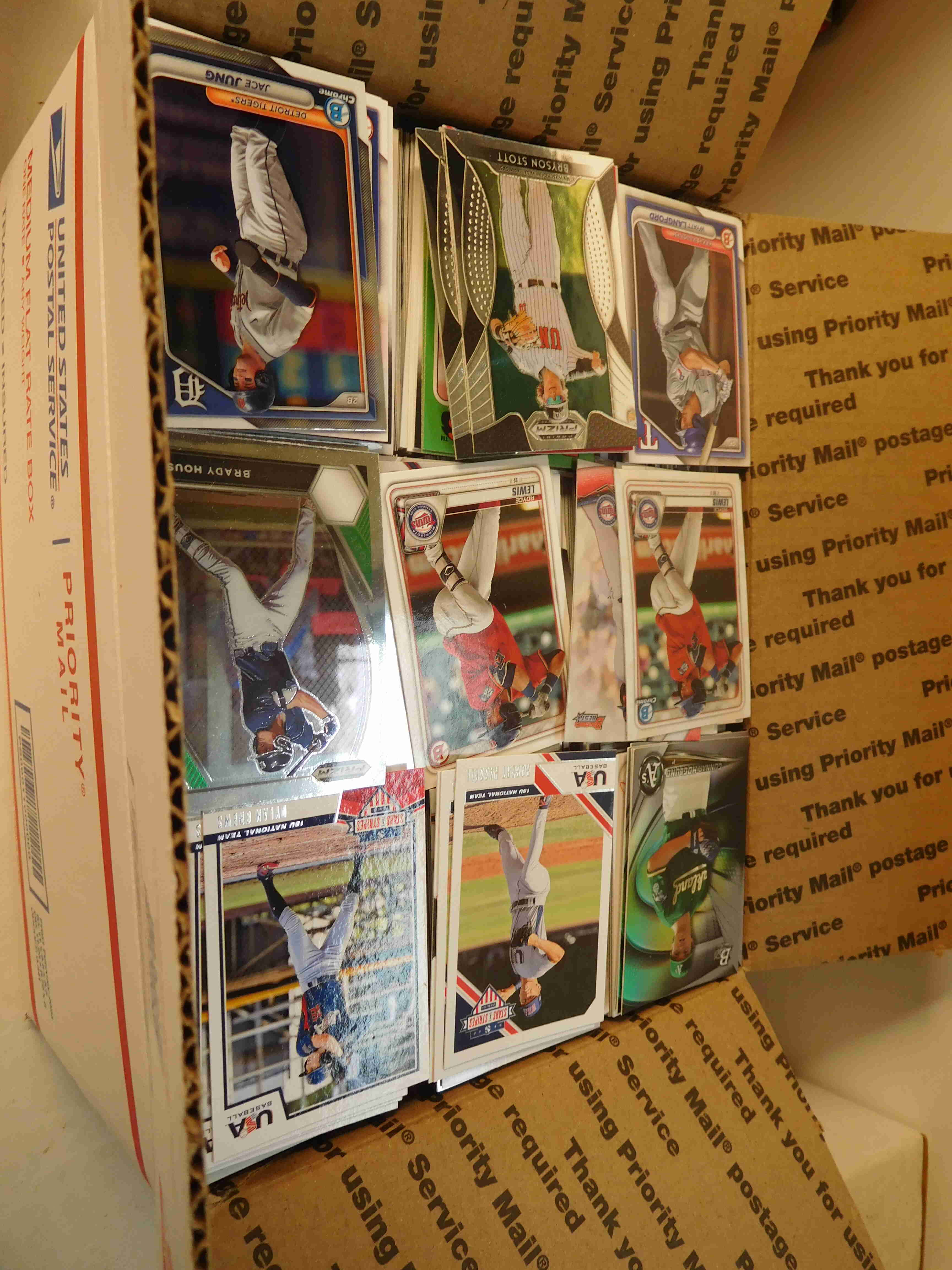 Medium Flat Rate Box packed full of Modern (mainly 2019-2024 cards with 90% Topps, Bowman, or other Topps Brands with maybe 10% Donruss or Panini) consisting of various Rookie and 1st Bowman with a few second year cards loosely collated by player. This is a great investment or speculators lot or a nice bit of inventory for any Sportlots Store. 1800 cards x .20 Sportlots minimum sale prioce = $360.00 value but of course there will be cards that are worth more. Ships in a Medium Flat Rate Box. Thanks for viewing our auction and be sure to look for future listings.