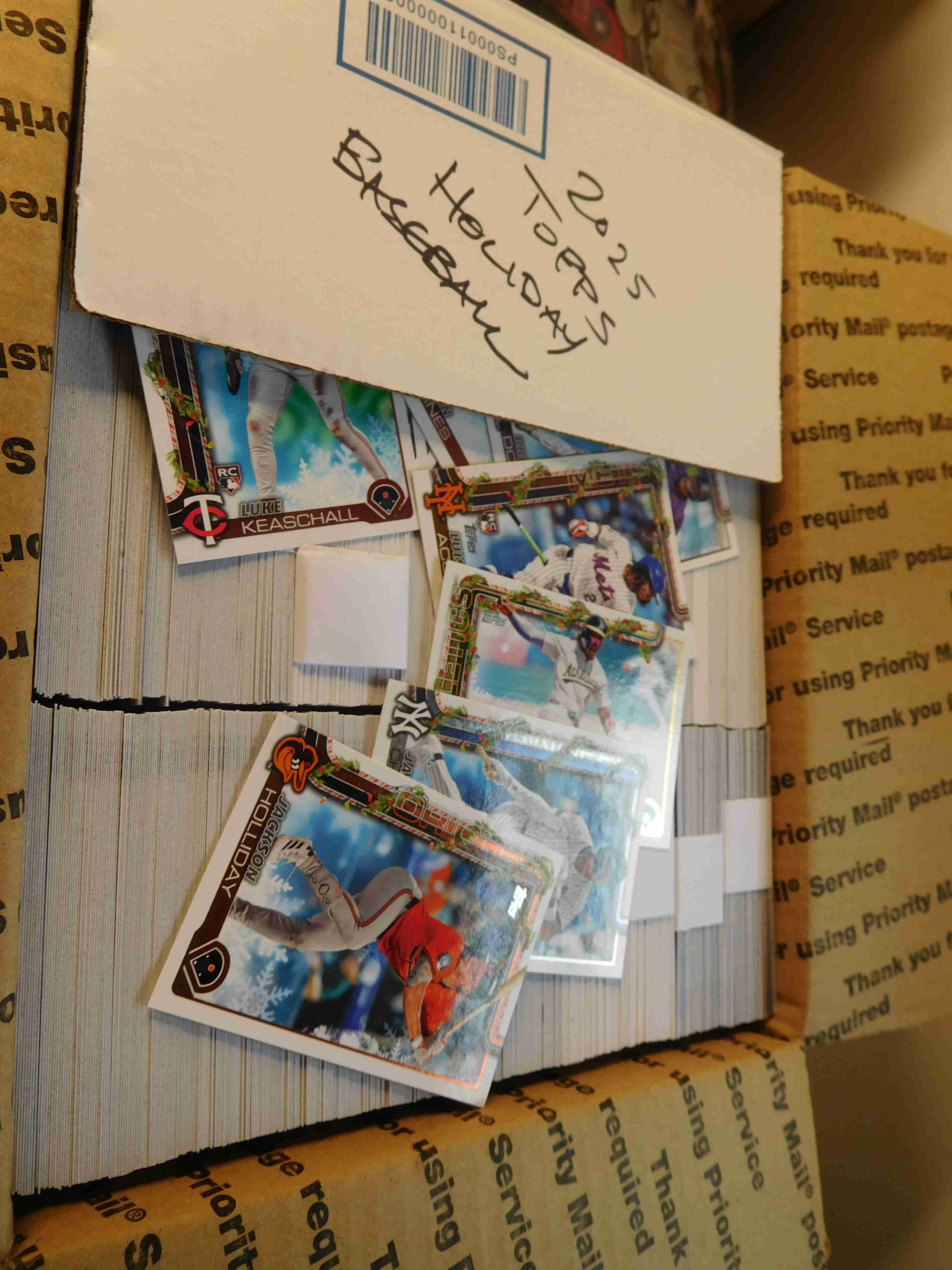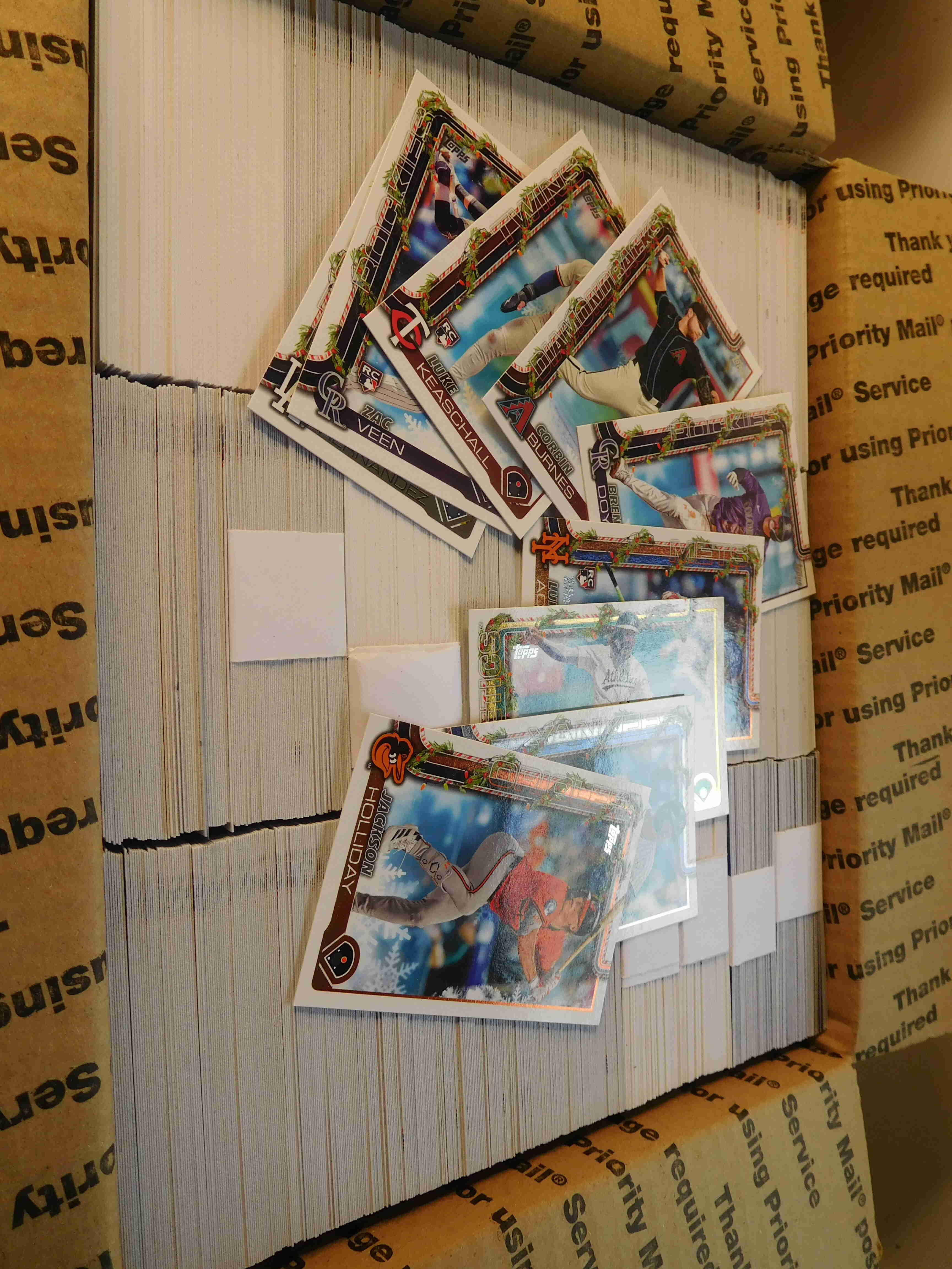 2200 (estimated) 2025 Topps Holiday Baseball Card Lot. Packed in a Medium Flat Rate Box. These are customer leftovers so you never know what is in there. Some customers (well most) take the inserts and the Shoheis and leave the rest but these have not been otherrwise picked through. At the Sportlots minimum of 20 cents per card this equates to at least $440 worth of value for your store. Thanks and good luck with your bidding. We will continue to list our bulk leftovers here moving forward. We have a bunch of recent years stuff that will be listed for the 3 major sports.