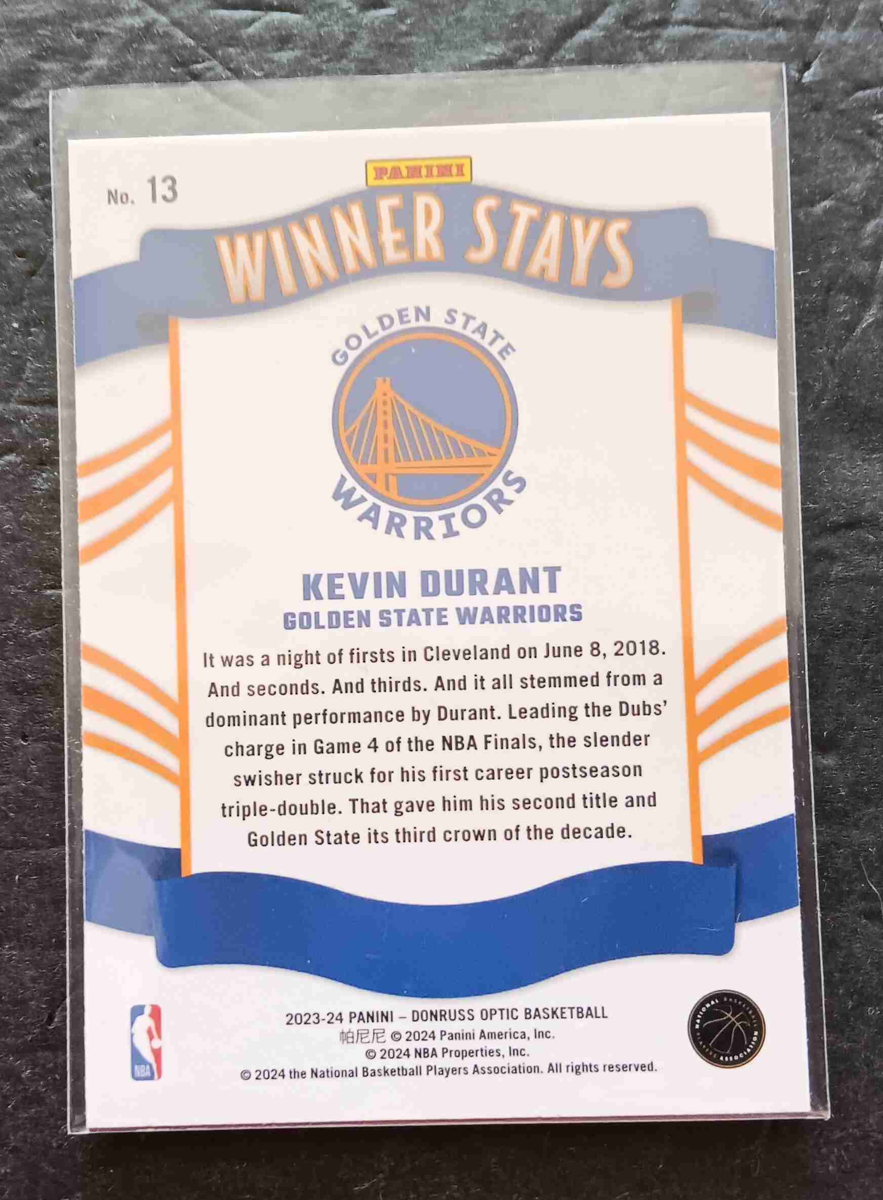This auction is for a 2023-24 Optic Kevin Durant Winner Stays.Card is number #13,and is in NM condition.Thanks for looking.