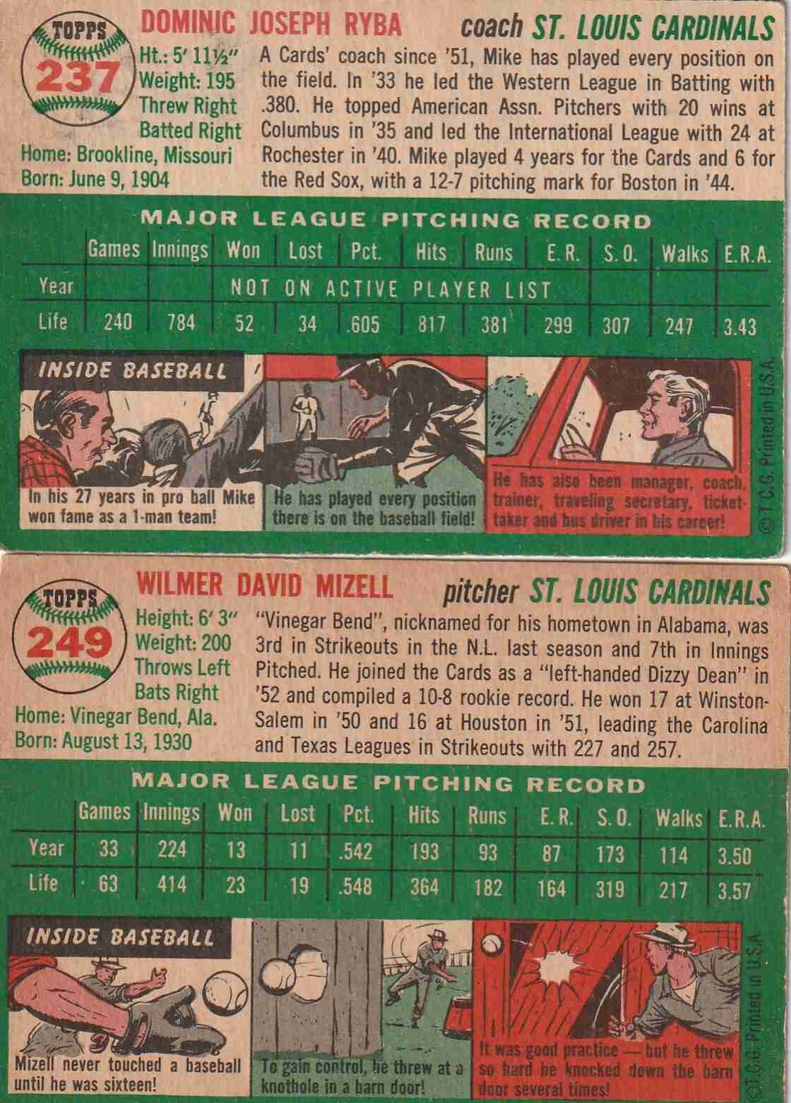 #237 Mike Ryba (Fair) several blemishes (mild indentures) #249 Wilmer Mizell (VG+/EX) upper right corner crease