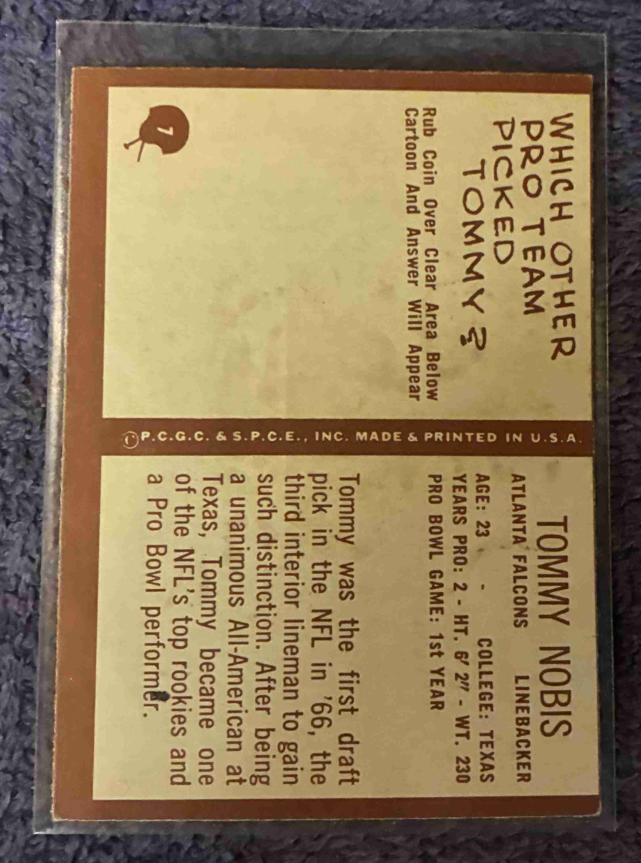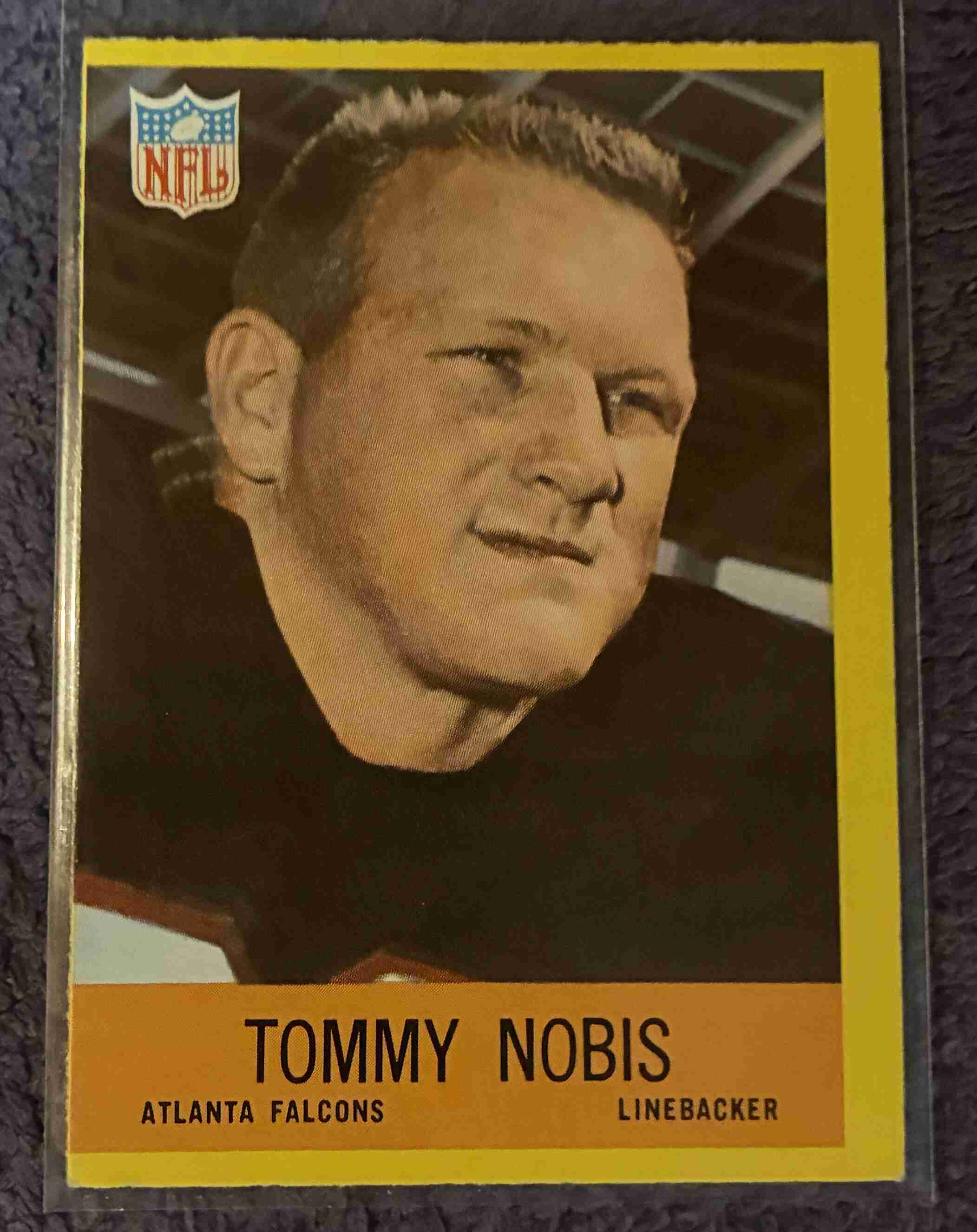 This is the 1967 Philadelphia football card #7 Tommy Nobis. Card is in EX condition but off-center. See scan.