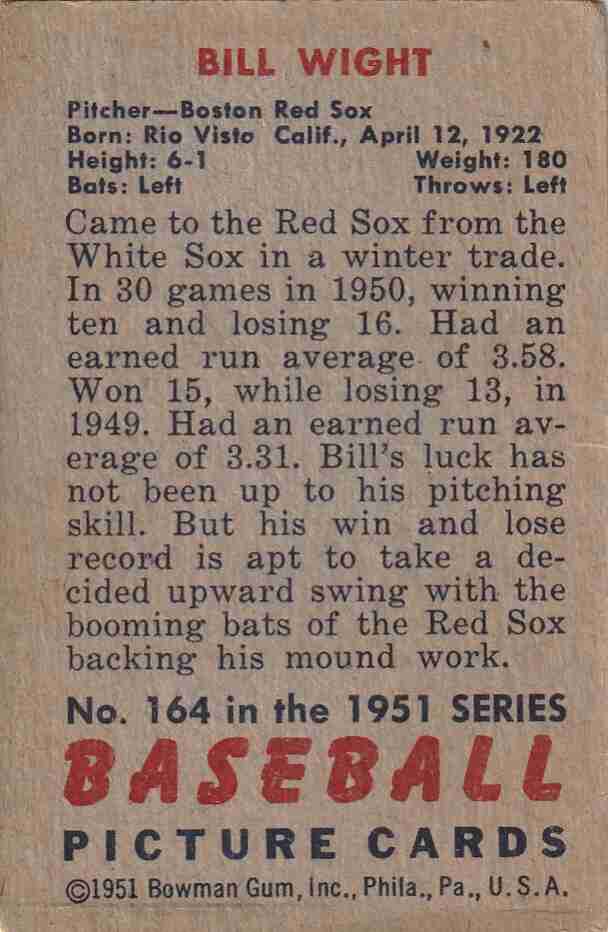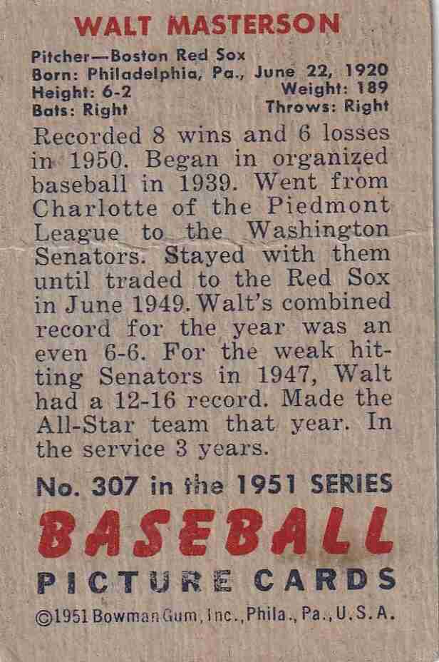#164 Bill Wight (VG+) Intact with corner wear and blemishes//fully legible back #307 Walt Masterson (VG+/EX) Intact//crease thru face from left to right//fully legible back