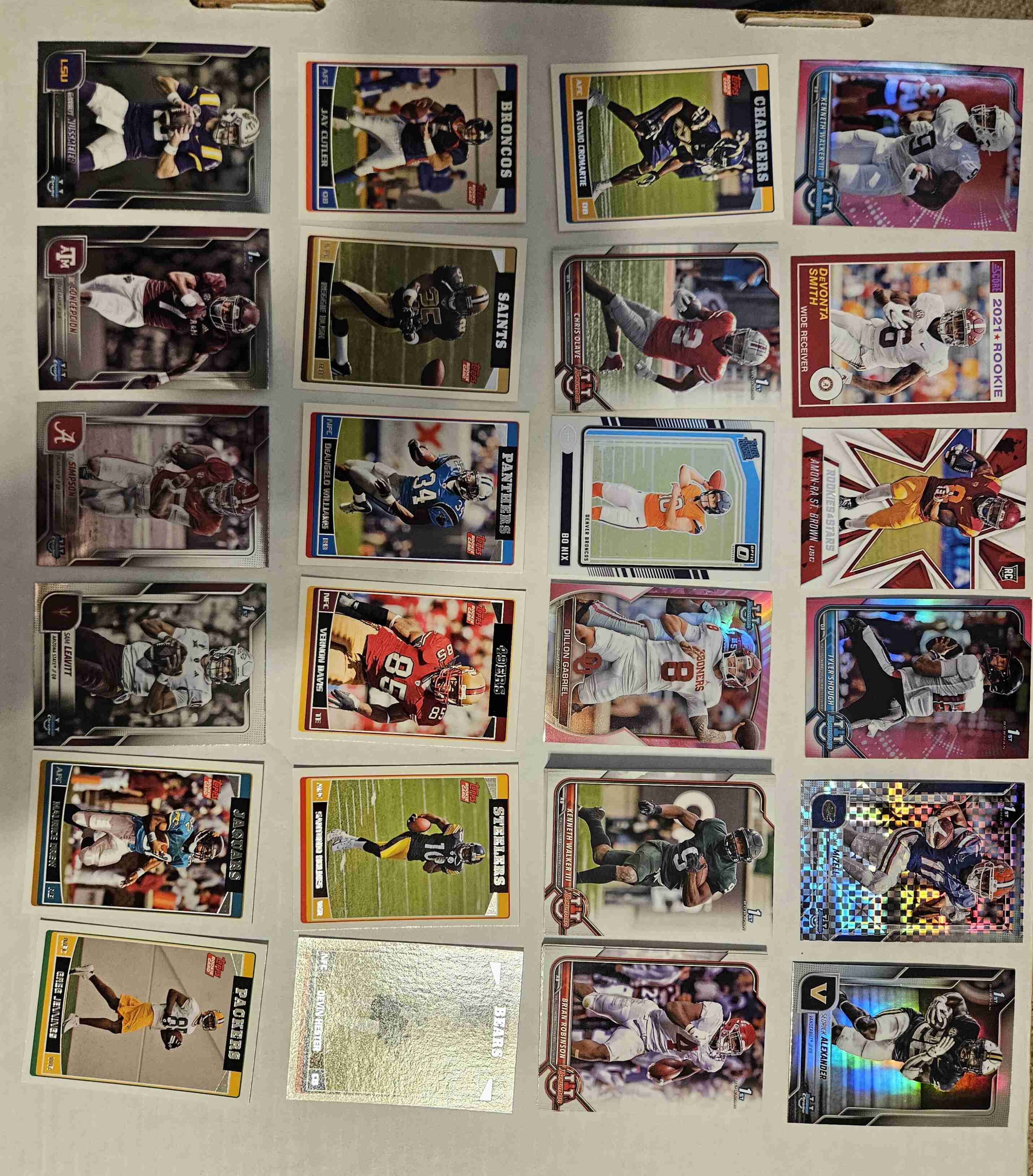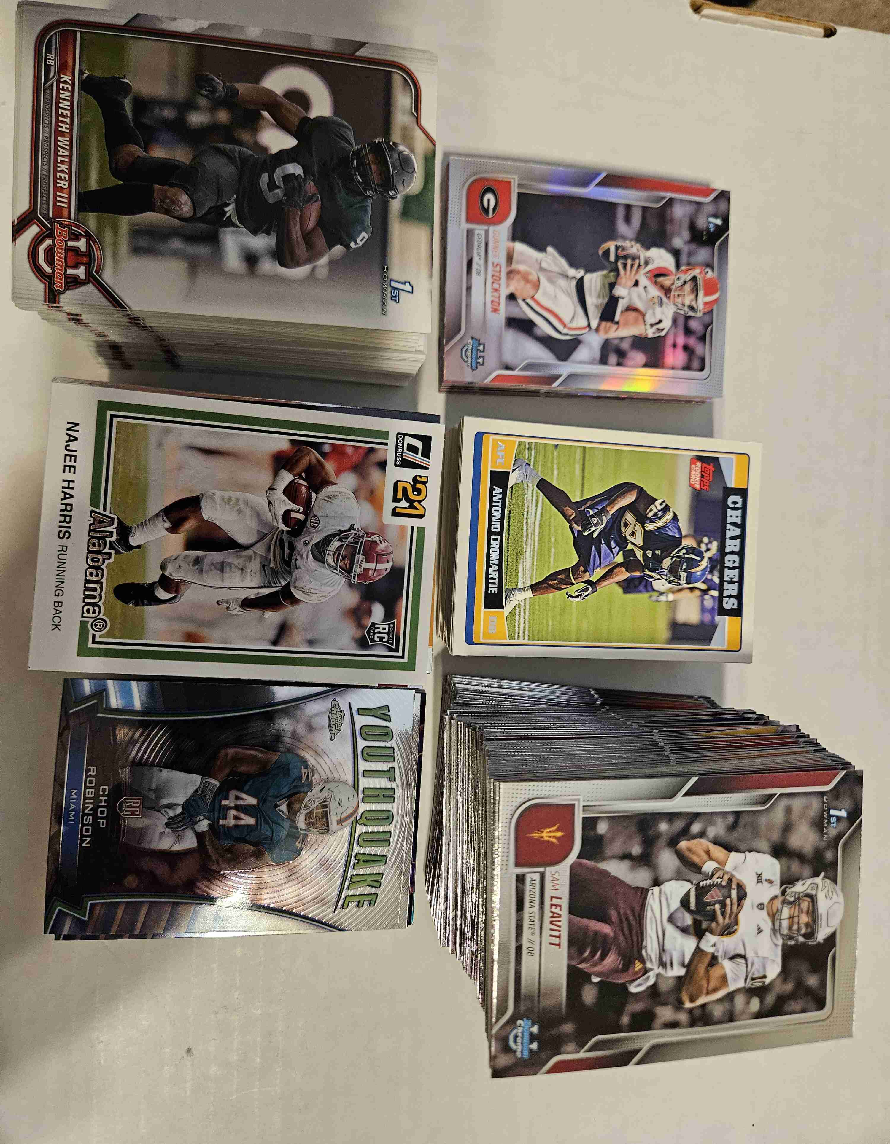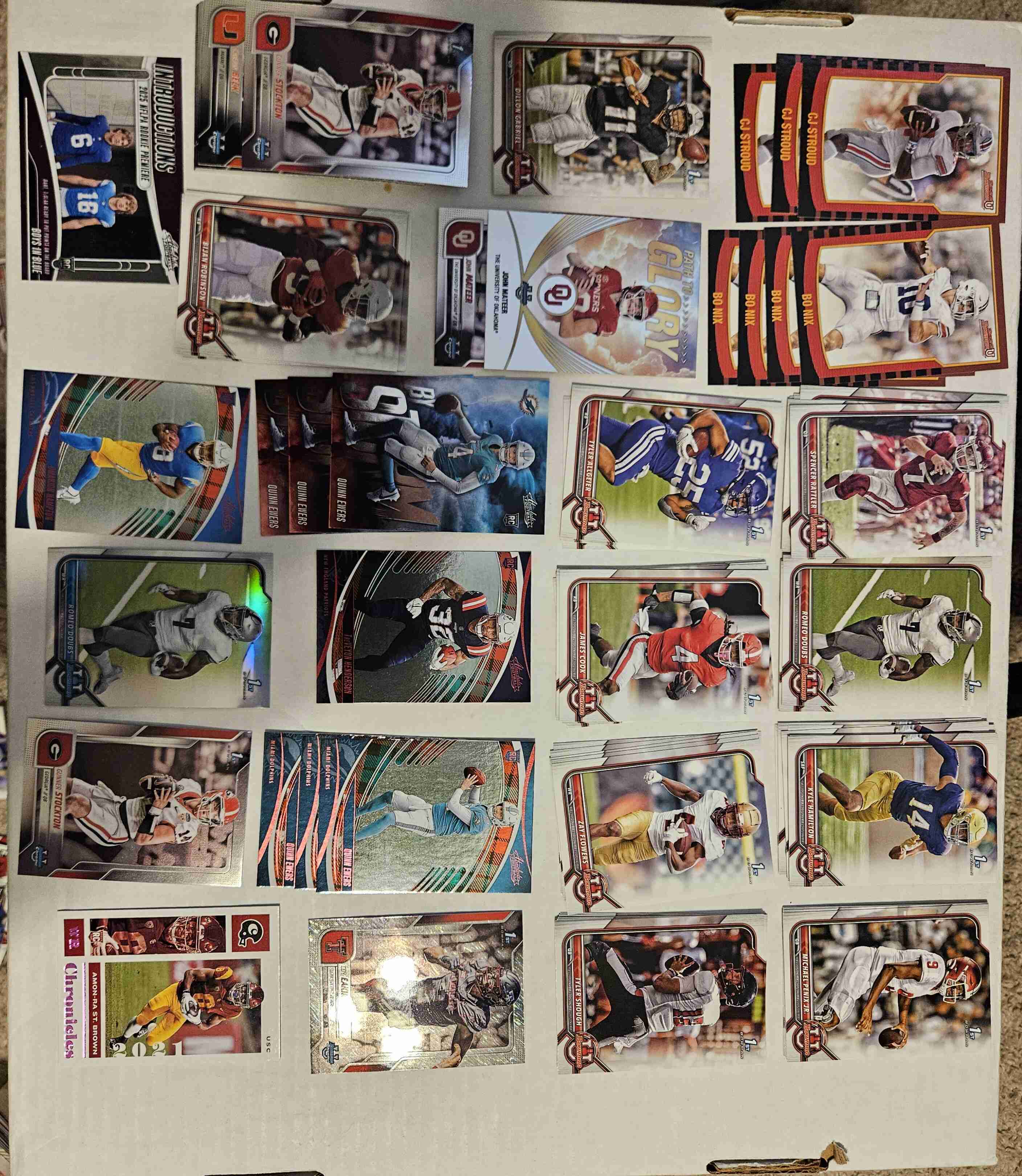 You are bidding on a 500 Card Football Rookie Lot. Shipping is $11.00 and will be shipped in a big envelope. The photos are an example of what you'll get. Great lot for shows. There is a complete set of 2006 Topps RCs and then the rest are from 2021 to 2025. There are 66 Refractors/Inserts. RCs include Bo Nix, CJ Stroud, Chris Olave, Tyler Shough. There are a ton of 1st Bowman Football rookies too.