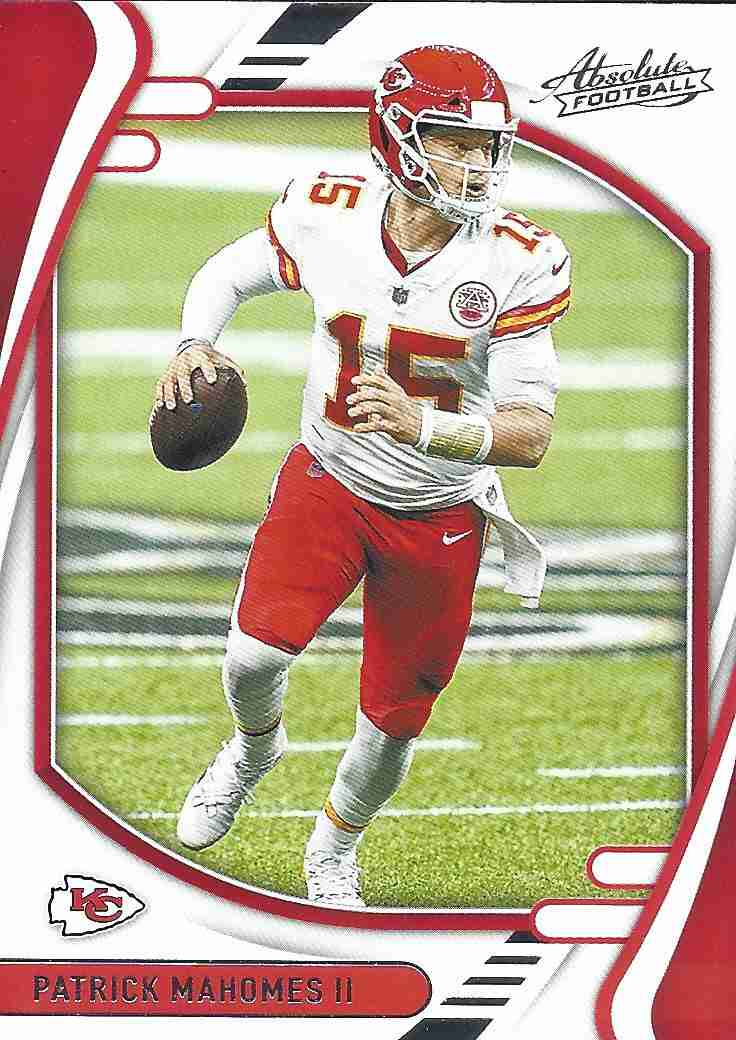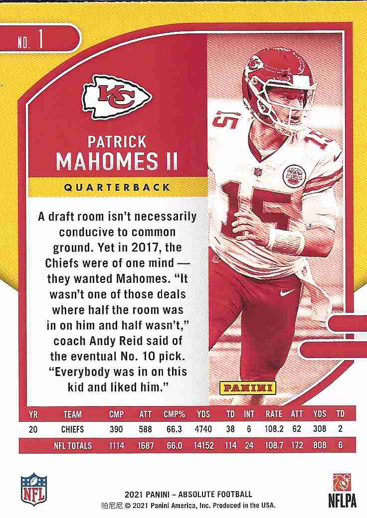 2021 Panini Absolute Card (#1) of the Kansas City Chiefs superstar quarterback Patrick Mahomes II. The card is in NM condition.