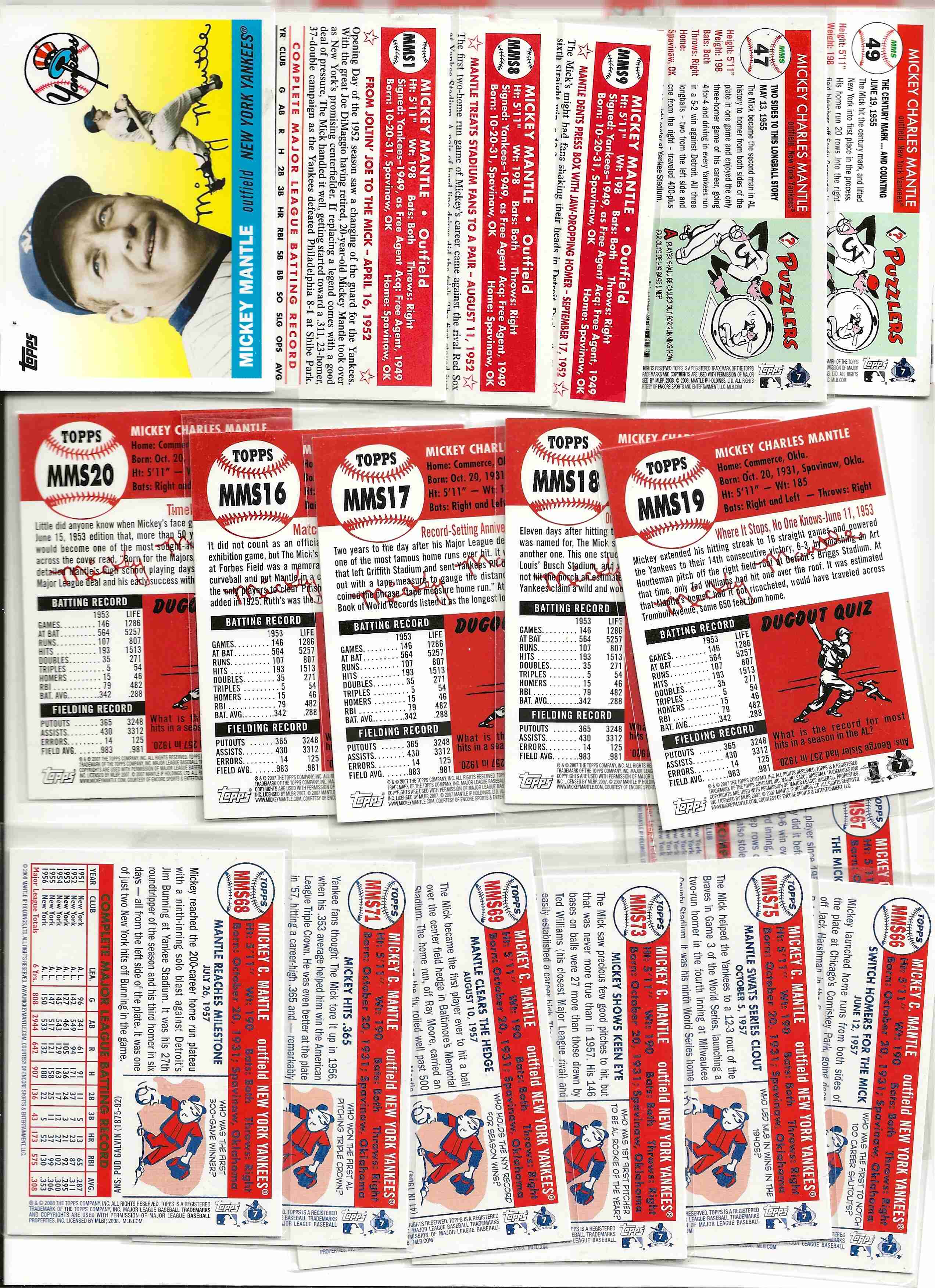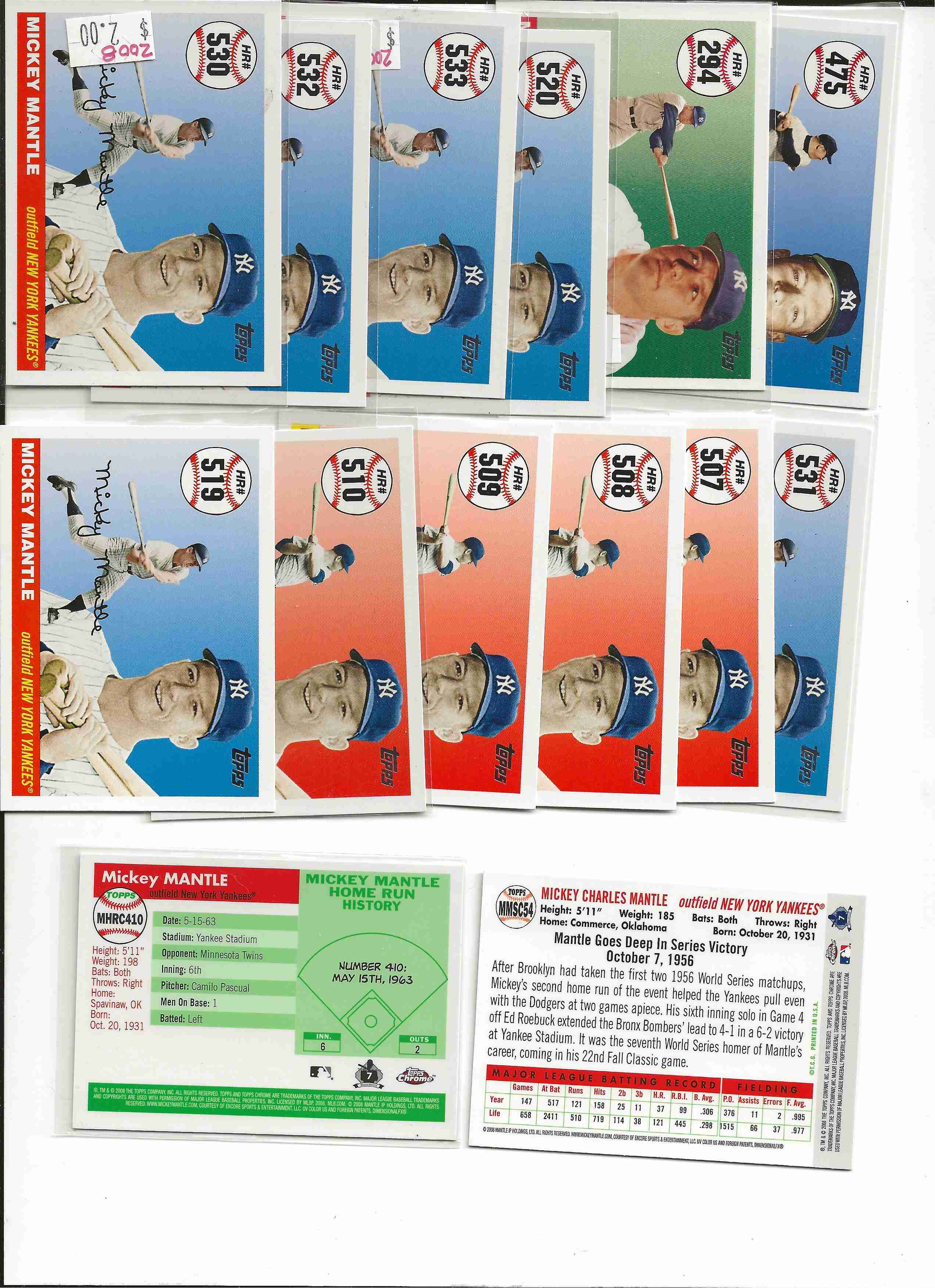 Mickey Mantle Story 22 of 75, no Dups. #MMS1 8 9 16 17 18 19 20 47 49 50 51 52 54 55 66 67 68 69 71 73 75 and Mickey Mantle Home Run #MHR294 475 507 508 509 510 519 520 530 531 532 533.o included are 2-Chromes one from each set. MMSC54 and MHRC410