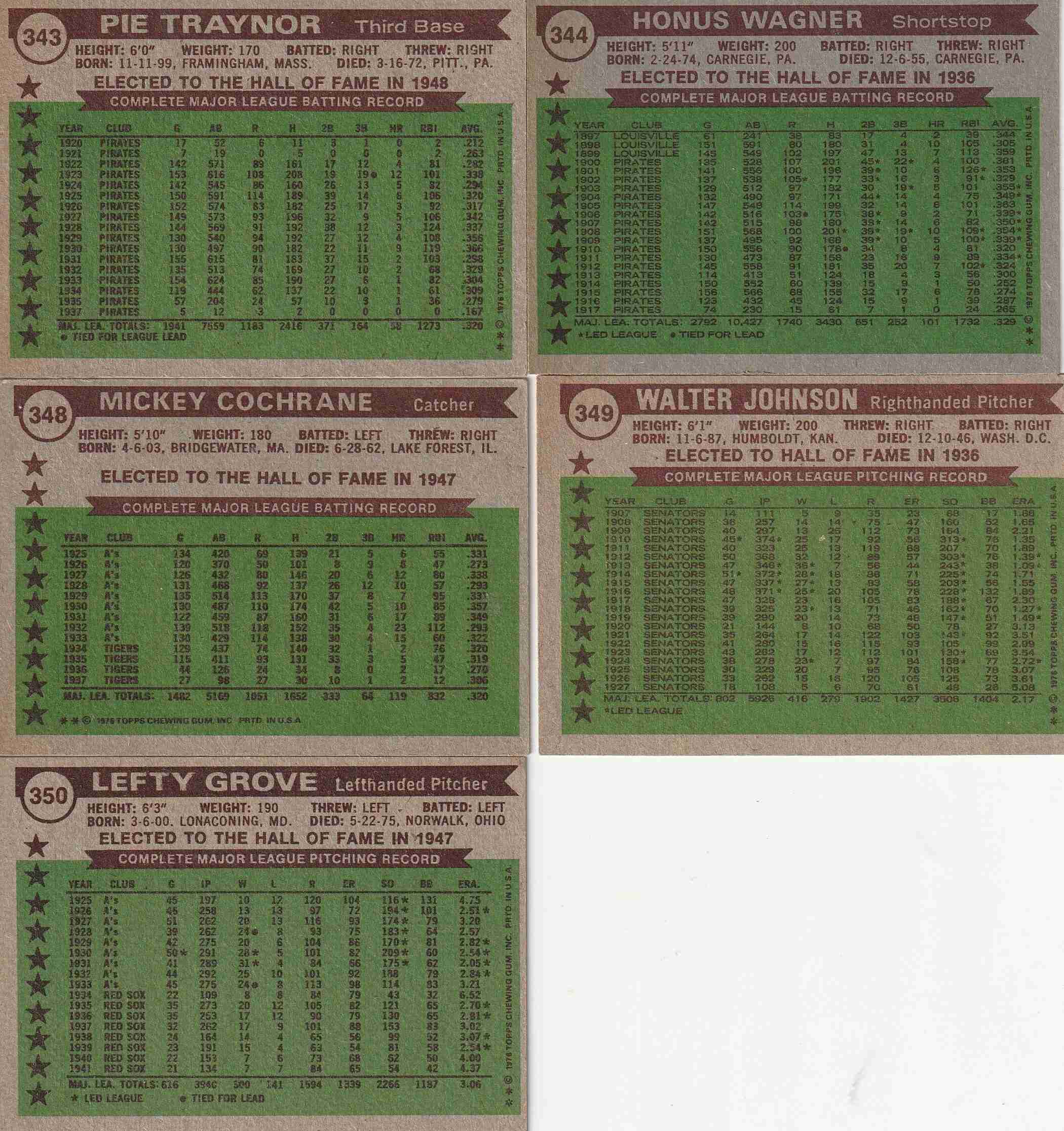 #343 Pie Traynor #344 Honus Wagner #348 Mickey Cochrane #349 WEalter Johnson #350 Lefty Grove (NM/M) gradeable lot