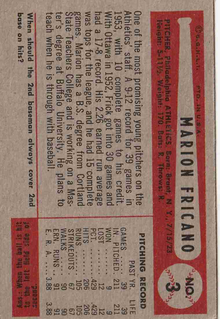 1954 Bowman #3 Marion Fricano Philadelphia Athletics (C2)