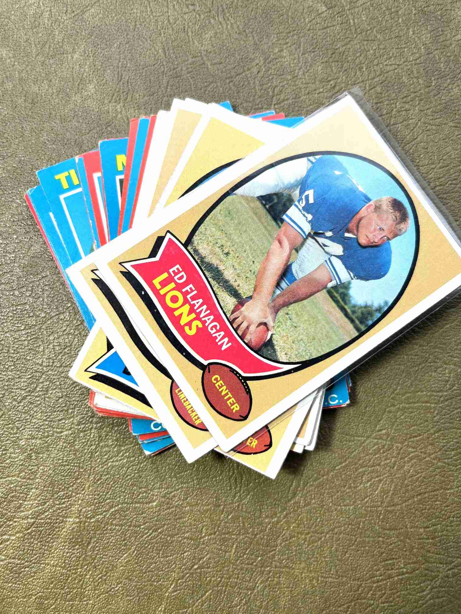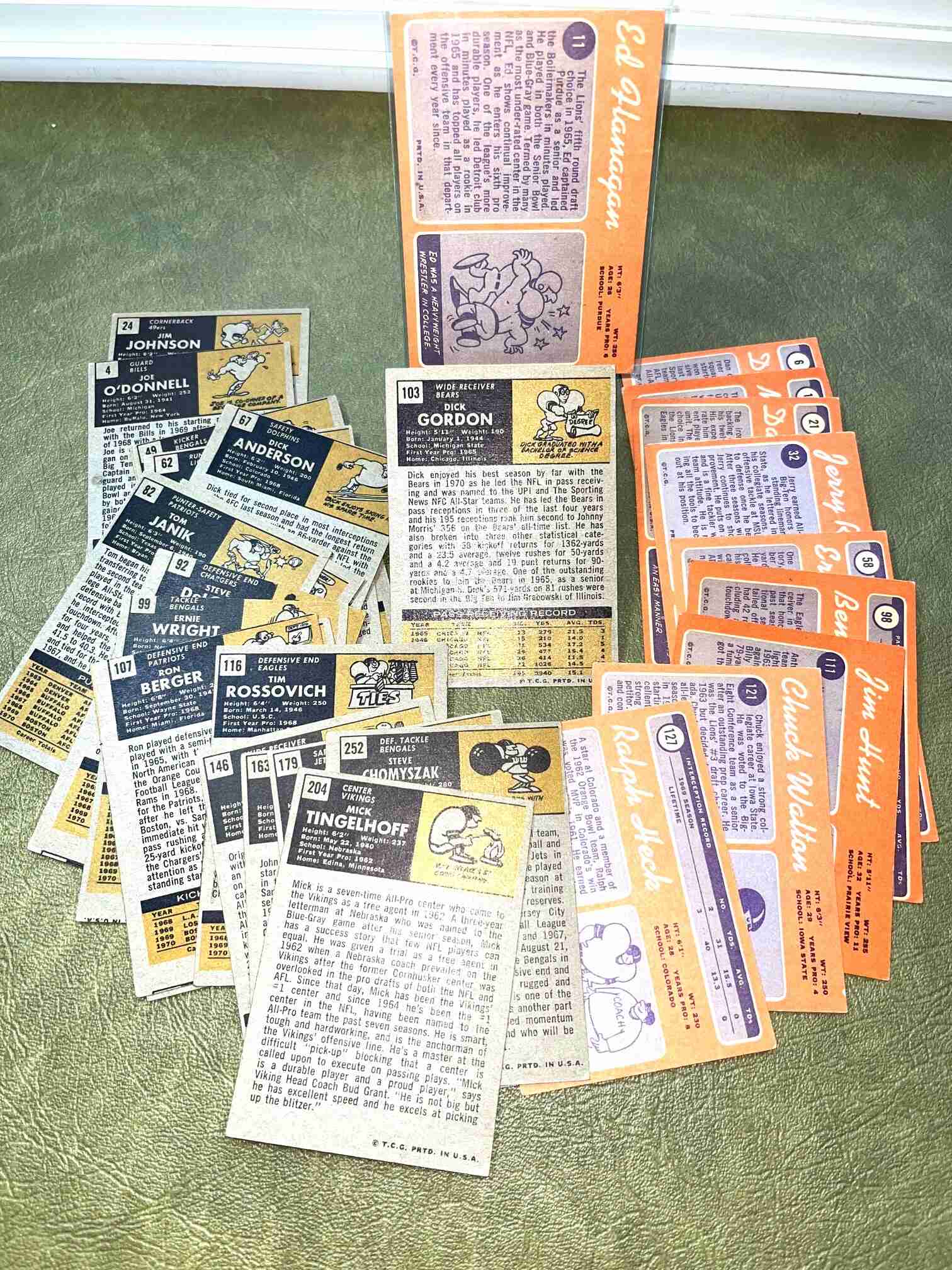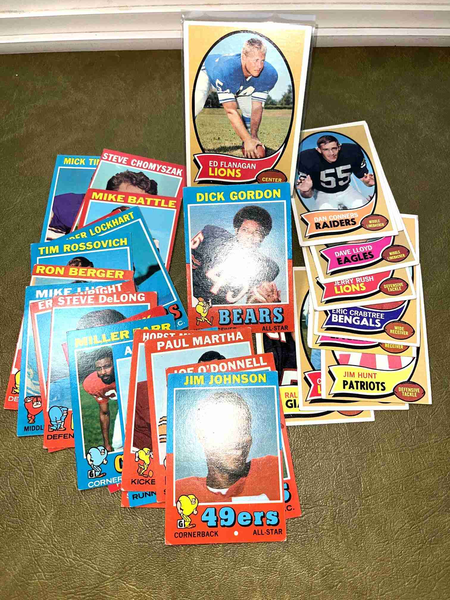 Lot of 30 cards including ten(10) 1970 Topps Football cards and twenty(20) 1971 Topps Football cards thought to be in mostly VG-EX condition but see photos for condition as displayed. Some creases and wax stains but no duplicates and arranged in numerical order. 1970 includes Ed Flanagan, Mike Haffner etc- all in series 1. 1971 includes Dick Gordon, Mick Tinglehoff etc. Please see other auctions for combined shipping.