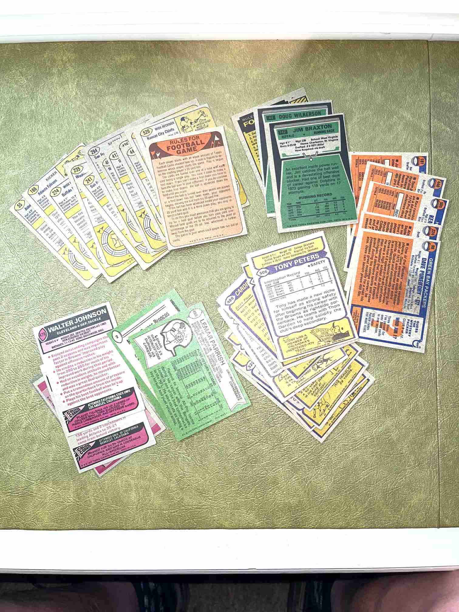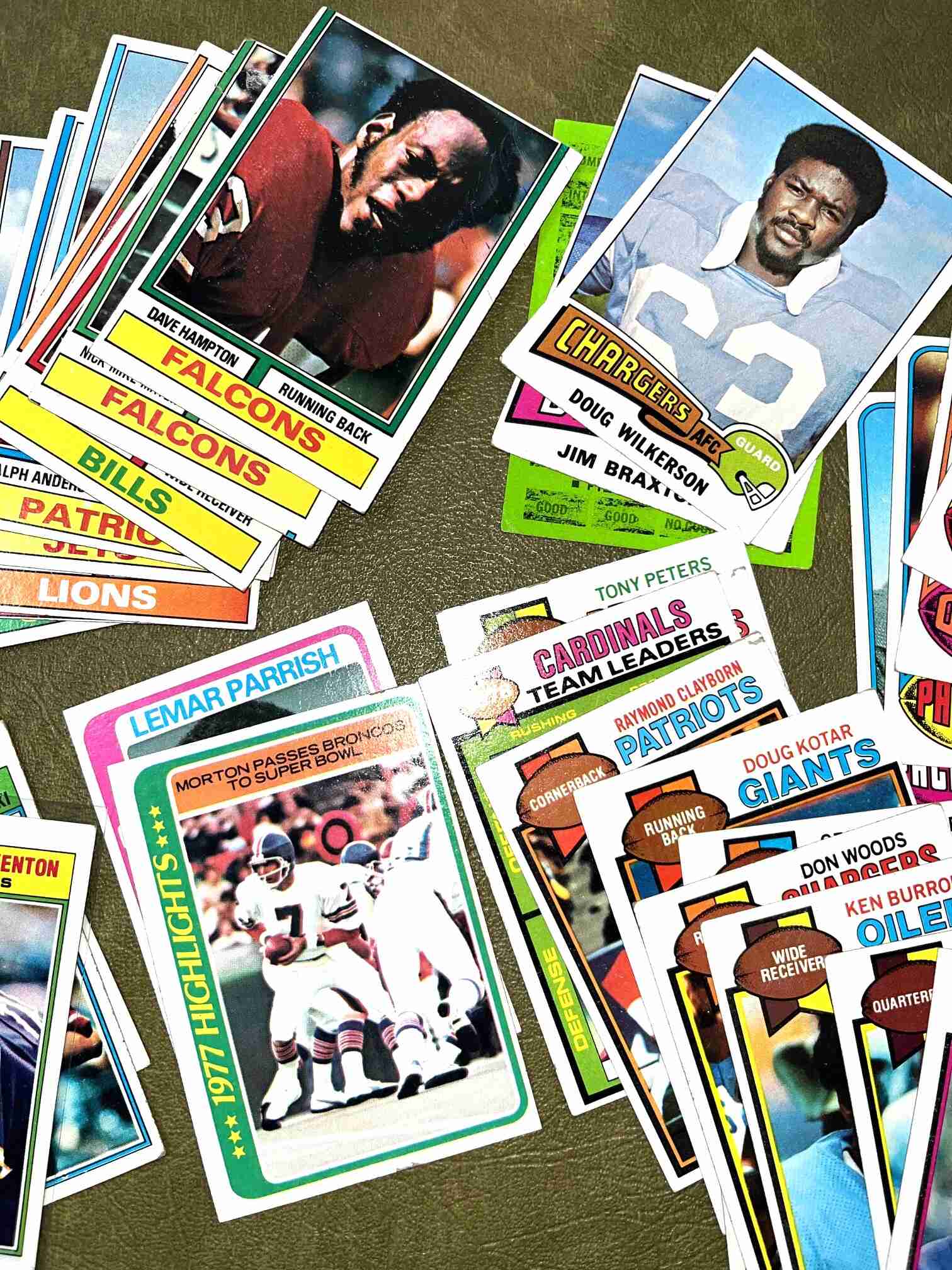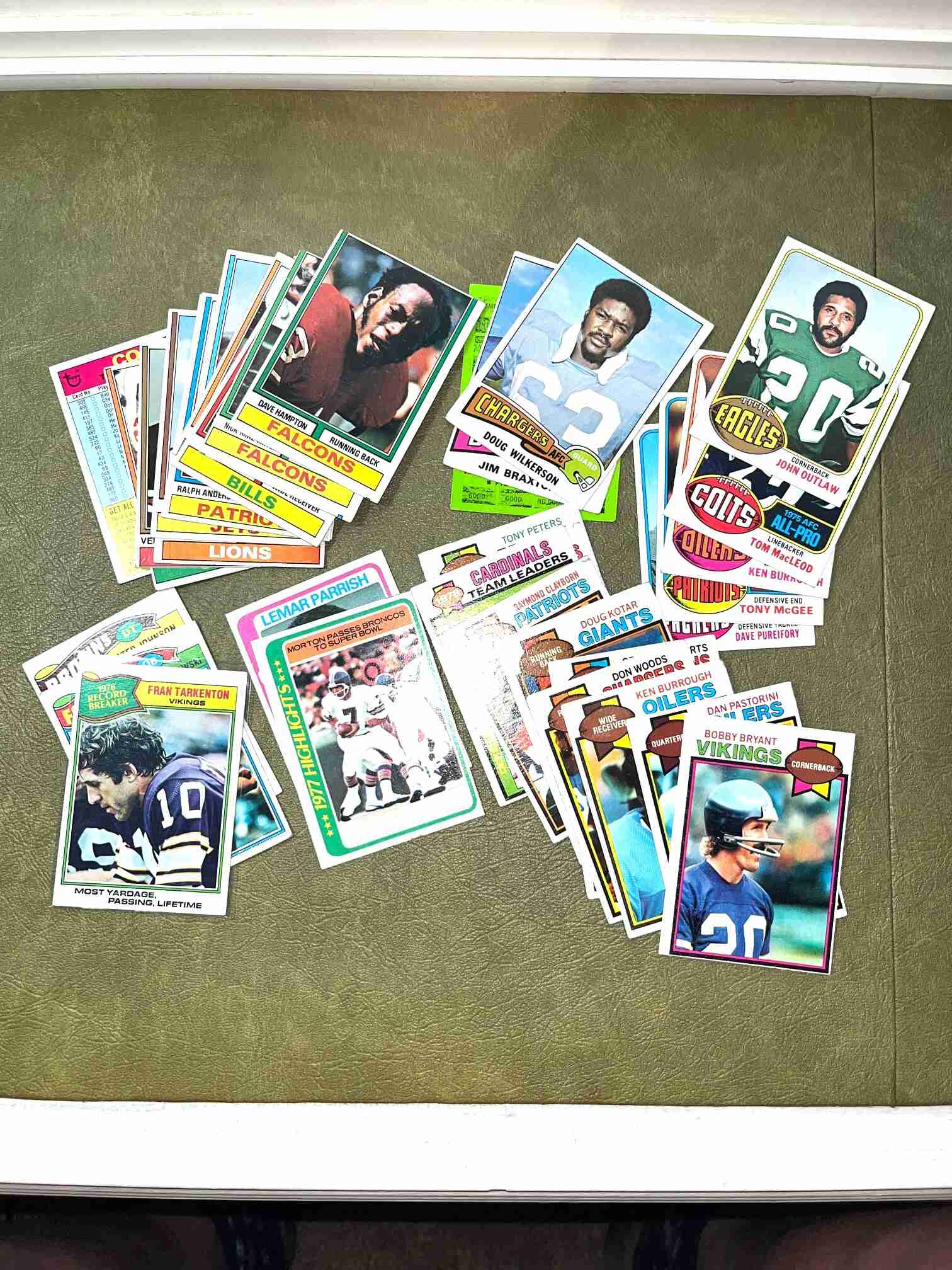Lot of 36 cards including thirteen(13) 1974 Topps Football cards, three(3) 1975 Topps Football cards, five(5) 1976 Topps Football cards, three(3) 1977 Topps Football cards, two(2) 1978 Topps Football cards and ten(10) 1979 Topps Football cards. Lot thought to be in mostly VG condition, some better, some worse, but see photos for condition as displayed- 1974 cards are in worst condition and about 6 have pinholes. Some creases and wax stains but no duplicates and arranged in numerical order. 1974 includes JD Hill(pinhole), Vern Holland etc. 1975 includes Jim Braxton, scratched football game card etc. 1976 includes Tom MacLeod All-Pro, Ken Burroughs etc. 1977 includes Fran Tarkenton Record Breaker, Steve Bartkowski etc. 1978 includes Craig Morton Highlights, Lemar Parrish. 1979 includes Dan Pastorini, Doug Kotar, Raymond Clayborn, Cardinals Team Leaders etc. Please see other auctions for combined shipping.