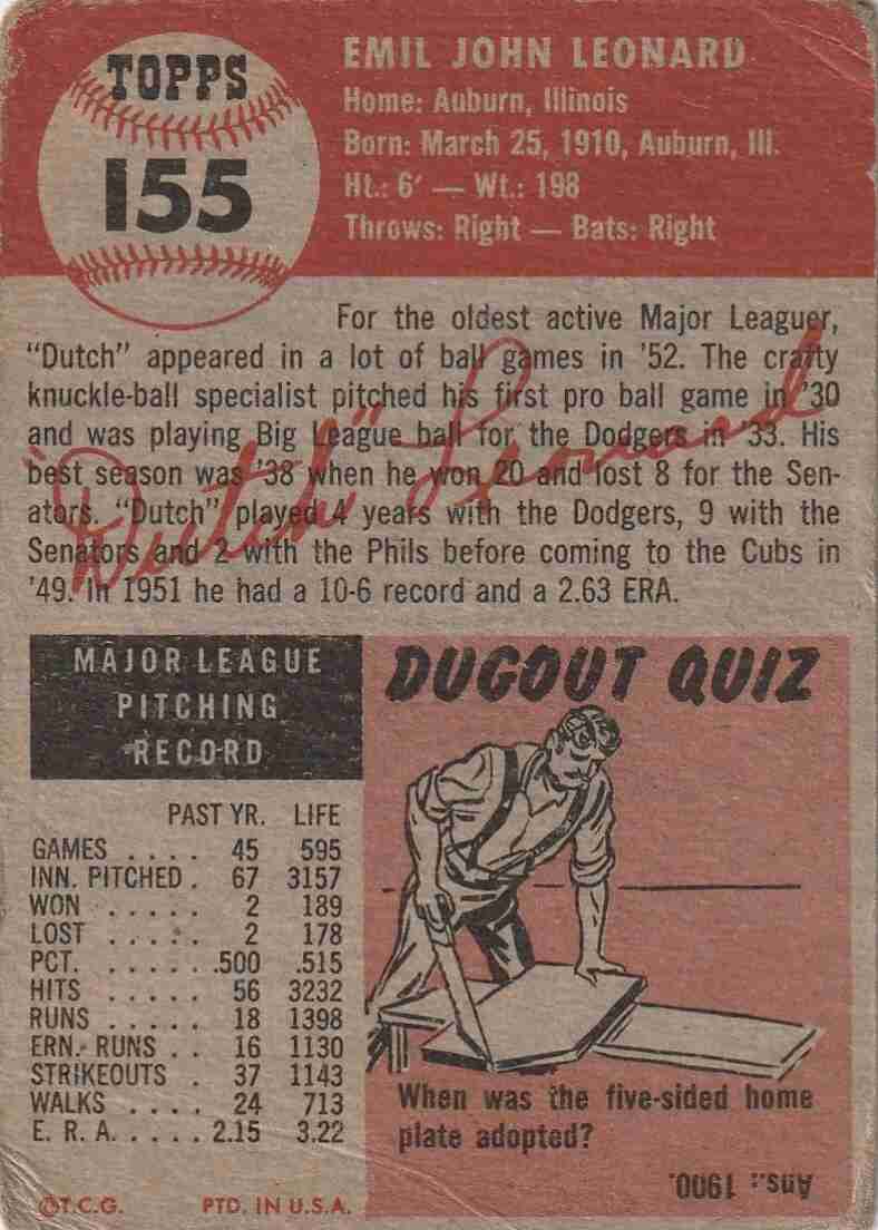 1953 Topps #155 Dutch Leonard Cubs (low grade)