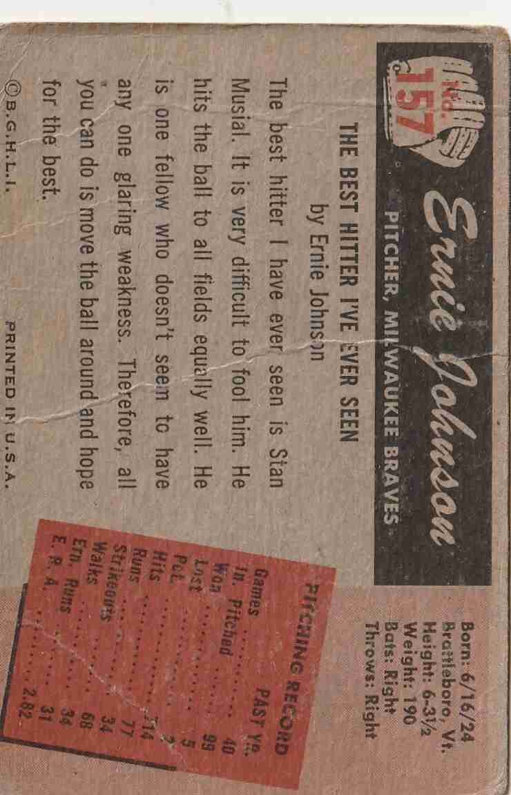 1954 Bowman #157 Ernie Johnson Milwaukee Braves (lower grad