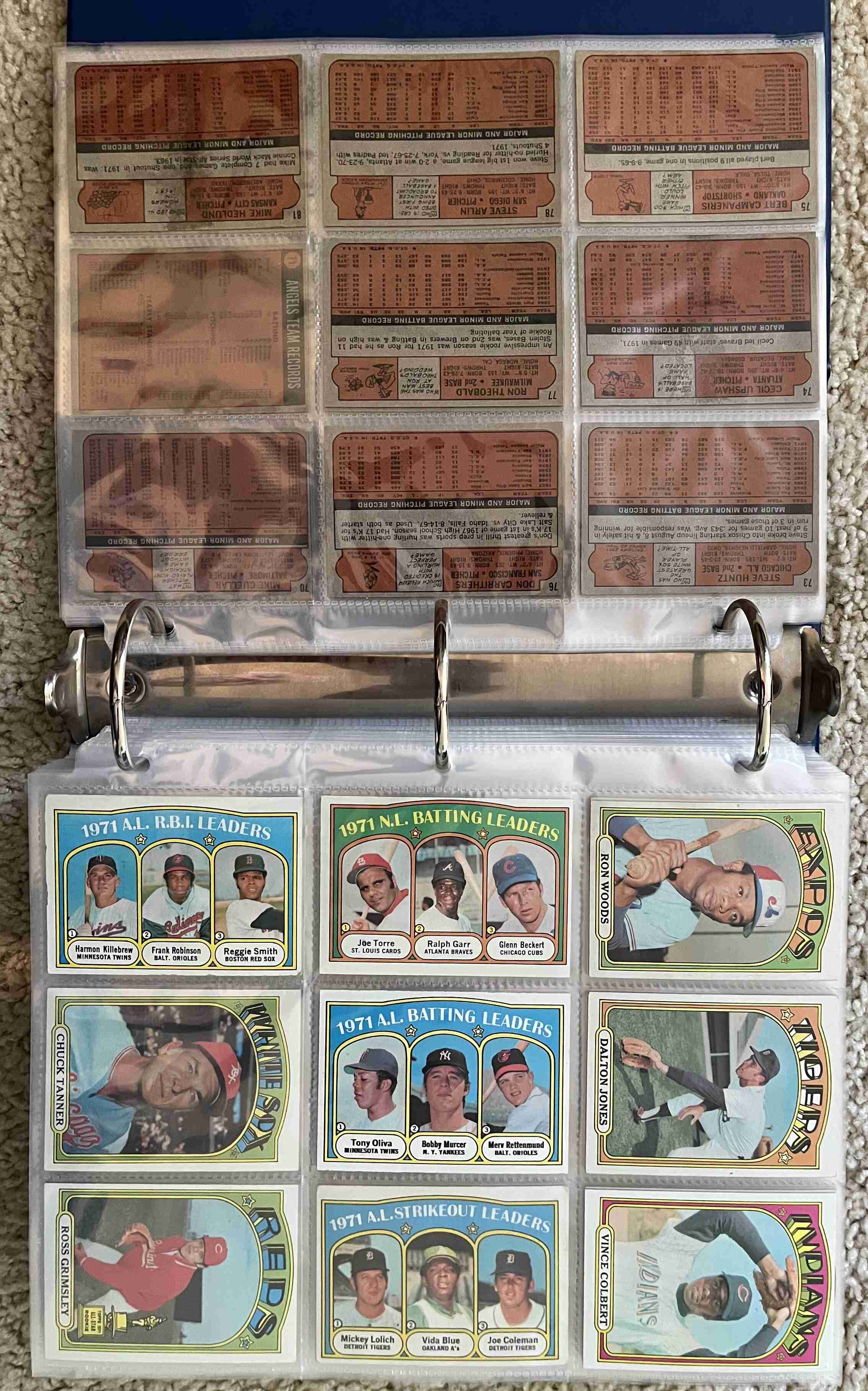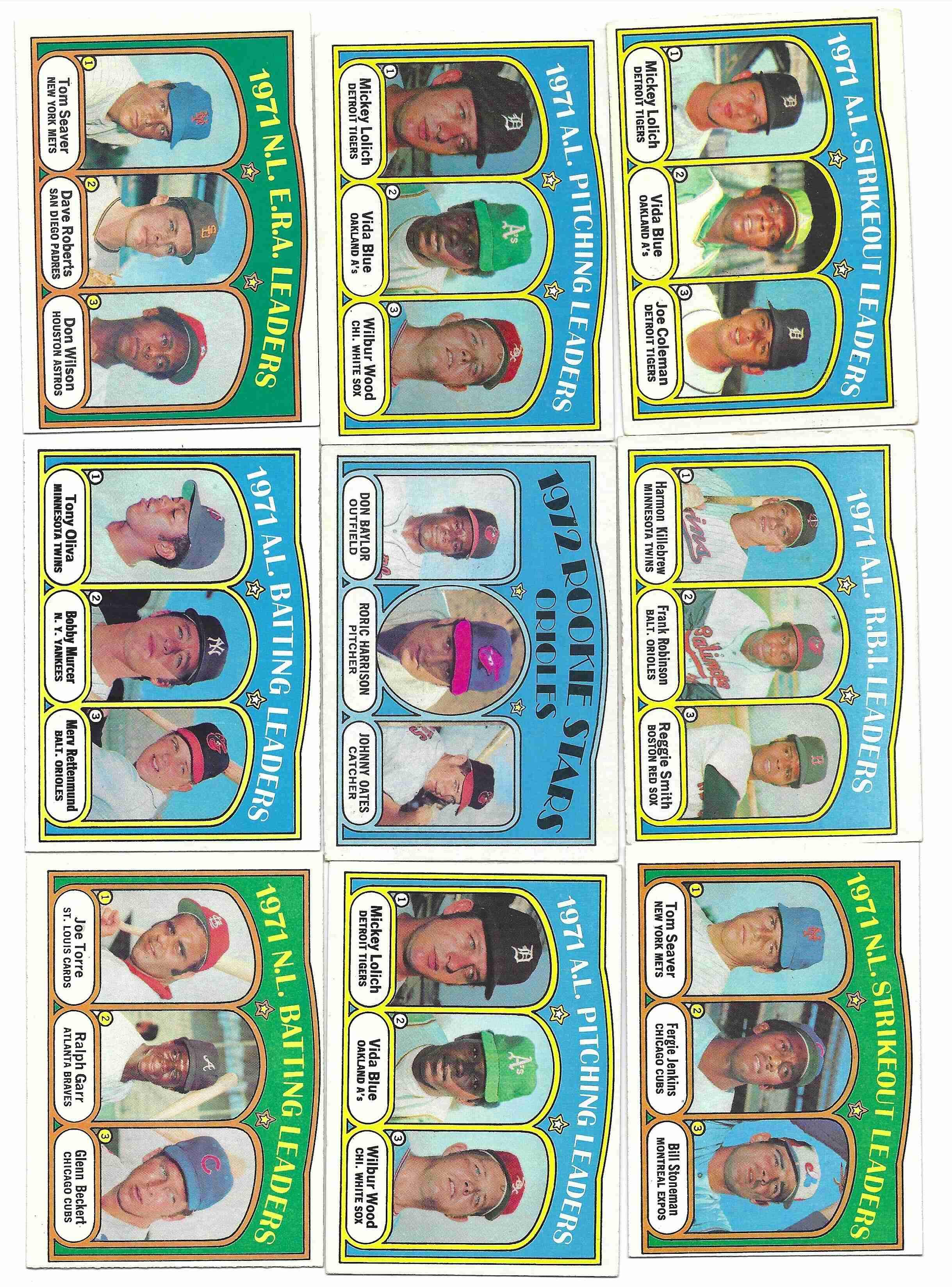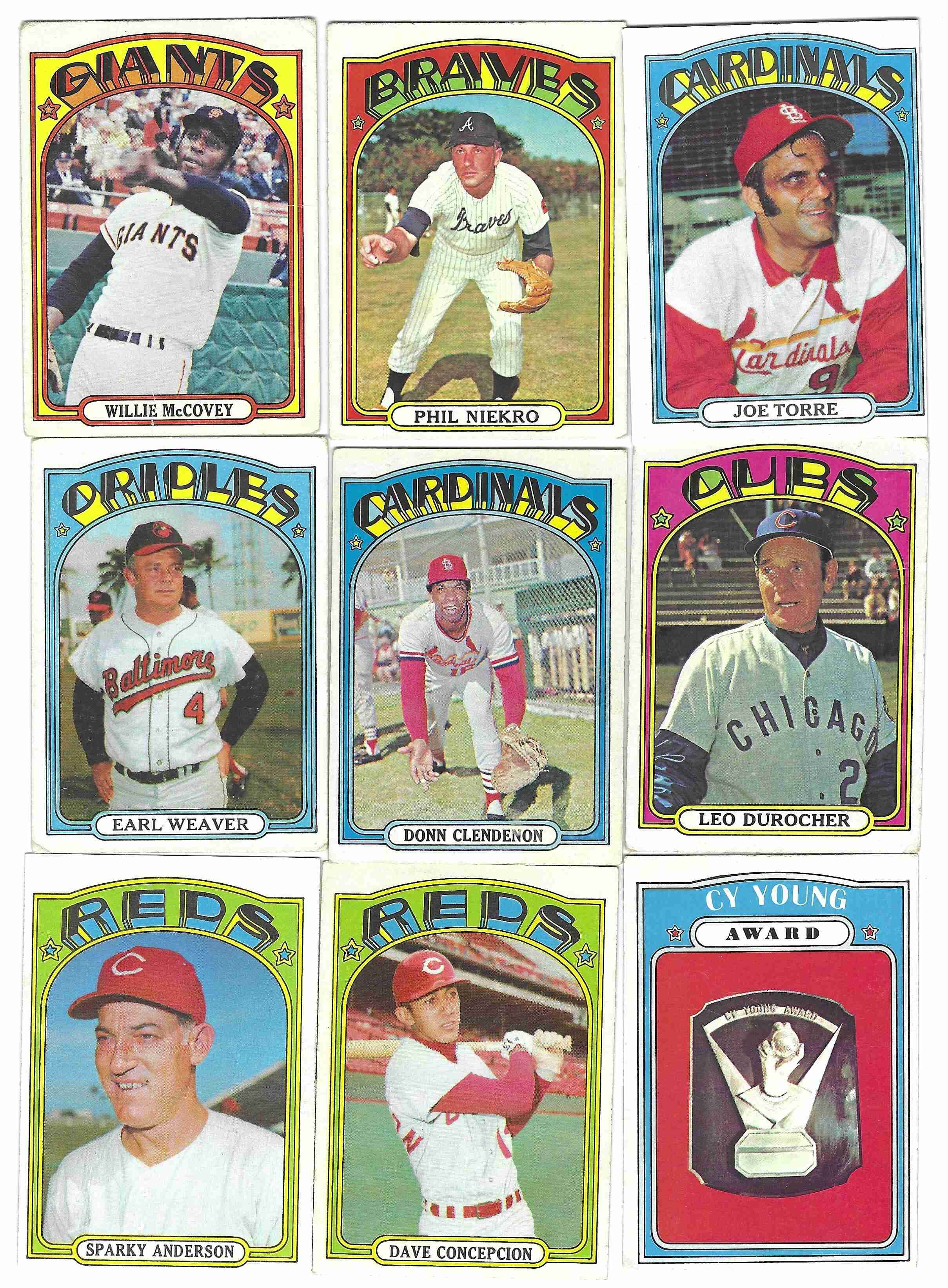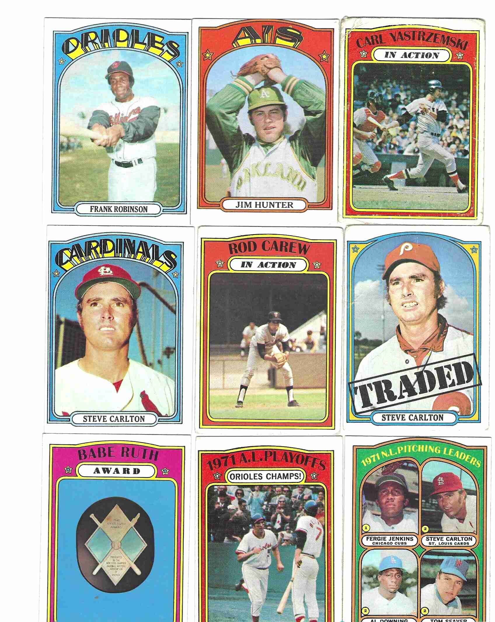 558 different 1972 Topps with HOFers & High Numbers. Includes: Hank Aaron IA, Willie McCovey, Reggie Jackson, Brooks Robinson, Al Kaline, Phil Niekro, Johnny Bench IA, Pete Rose IA, Rod Carew IA, Carl Yastrzemski IA, Harmon Killebrew IA, Jim Hunter, Steve Carlton Traded, Dave Kingman RC, Gaylord Perry, Steve Carlton, Don Baylor, Expos & Reds Team, Al Oliver, Charlie Hough RC, Cards are g-vg on average, a few have creases or writing. Nice starter lot.