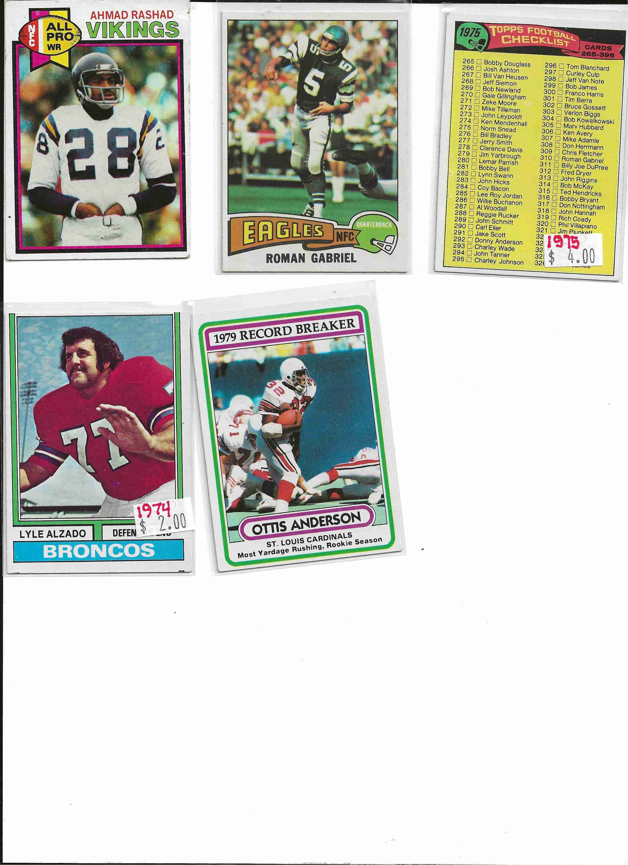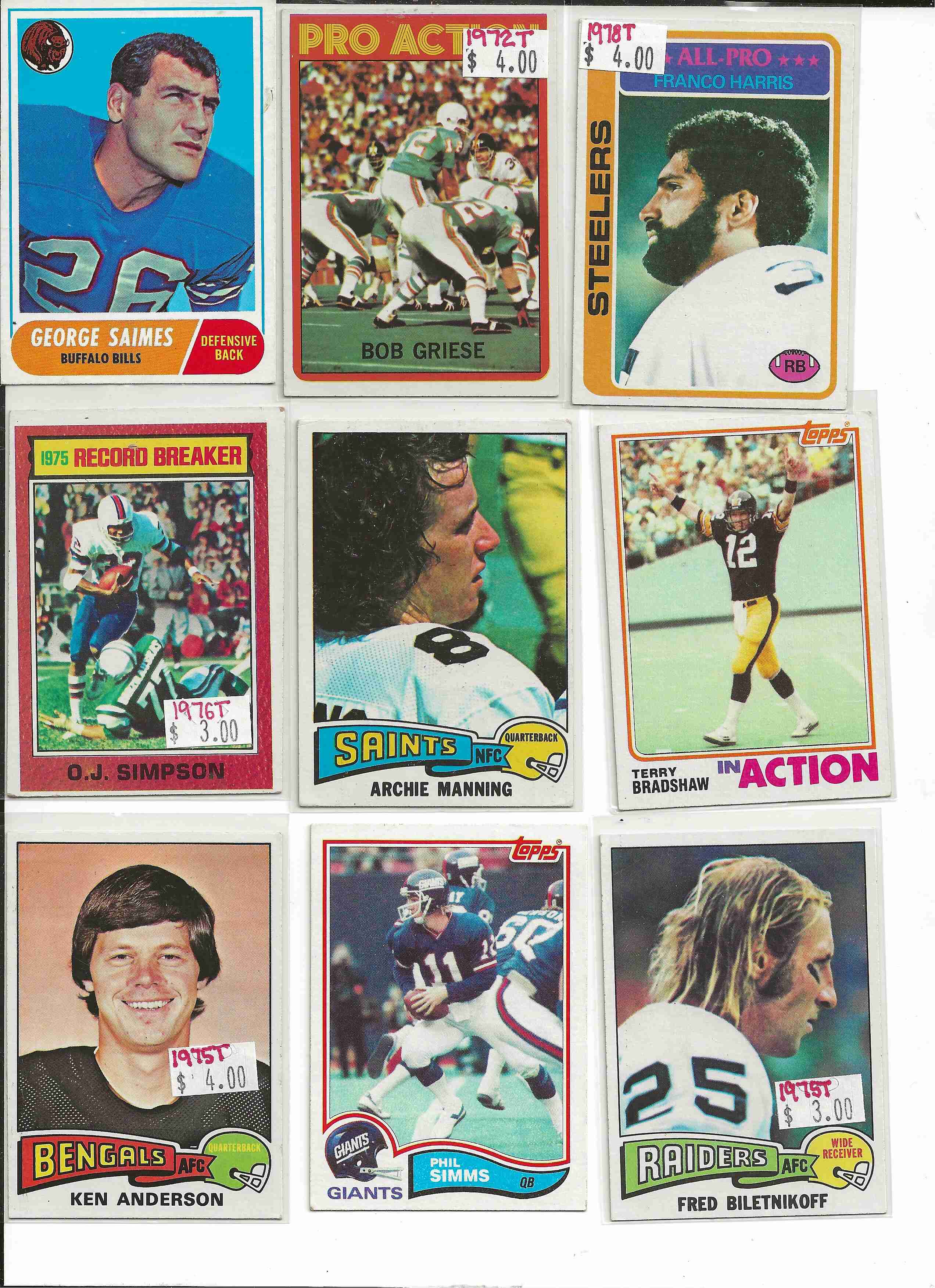 Consider lot excellent, no crease, no ink, no wax. may have soft corners or off center. Cards include 1974 Lyle Alzado. 1980 Ottis Anderson. 1975 Roman Gariel, 1975 Checklist. 1979 Ahmad Rashad. George Saimes, unknow yer. 1975 Fred Bilentnikoff, 1982 Phil Simms, 1975 Ken Anderson, 1976 OJ Simpson RB. Terry Bradshaw In action (Year?)