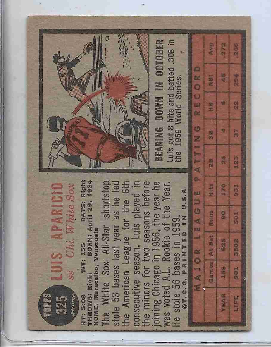 1962 Topps #325 ~ Luis Aparicio Chicago White Sox HOF