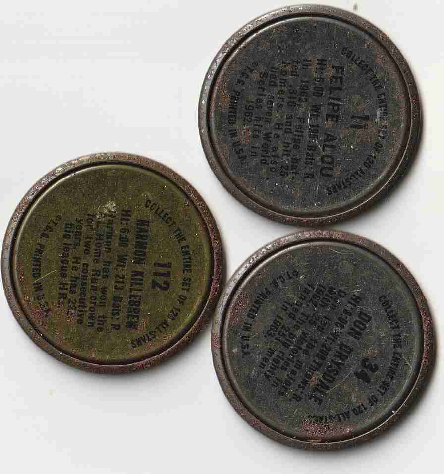 #11 Felipe Alou #112 Harmon Killebrew #34 Don Drysdale condition-(All have rim and back wear/tarnish//but are legible//all fronts are decent//Alou is the best)