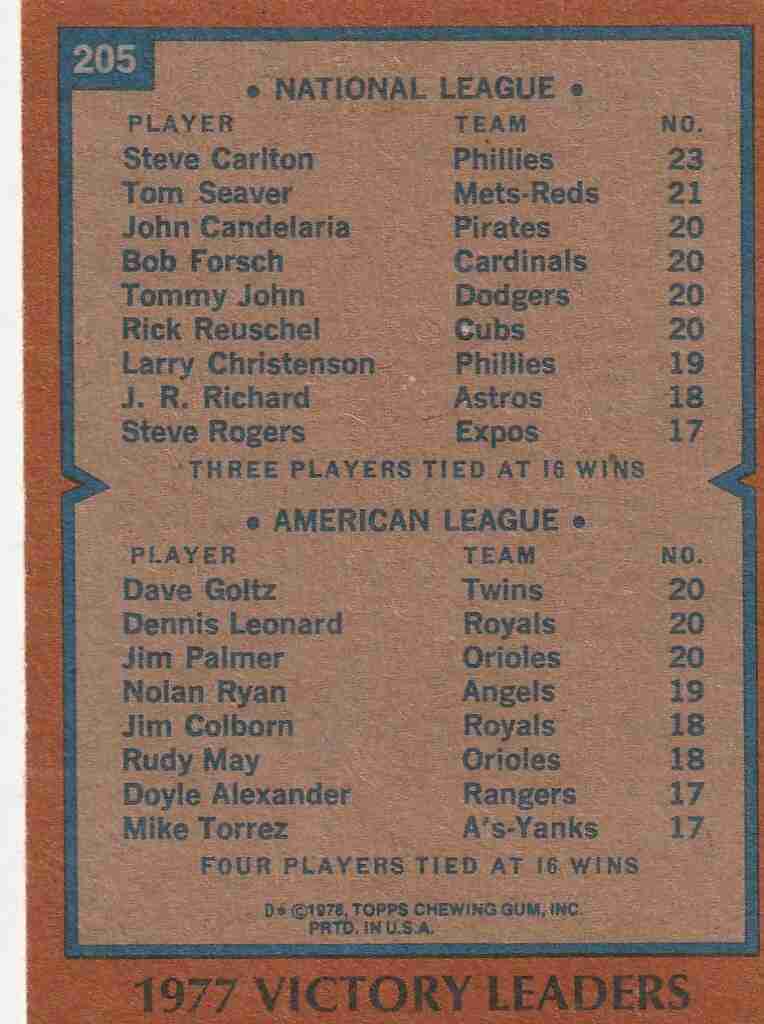1978 Topps #205 '77 Victory Leaders Carlton-Palmer