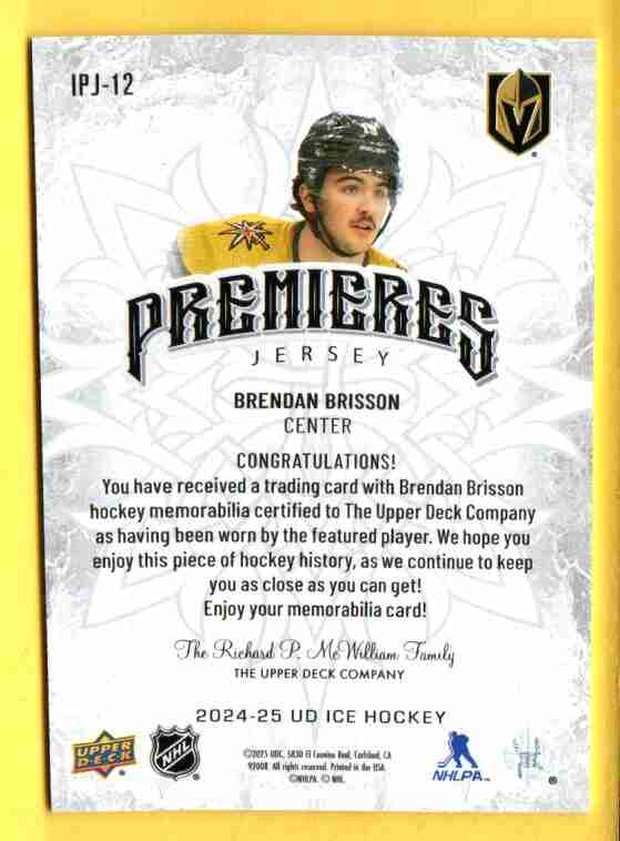 Brendan Brisson #IPJ-12 2024 Upper Deck Ice Premieres Jersey