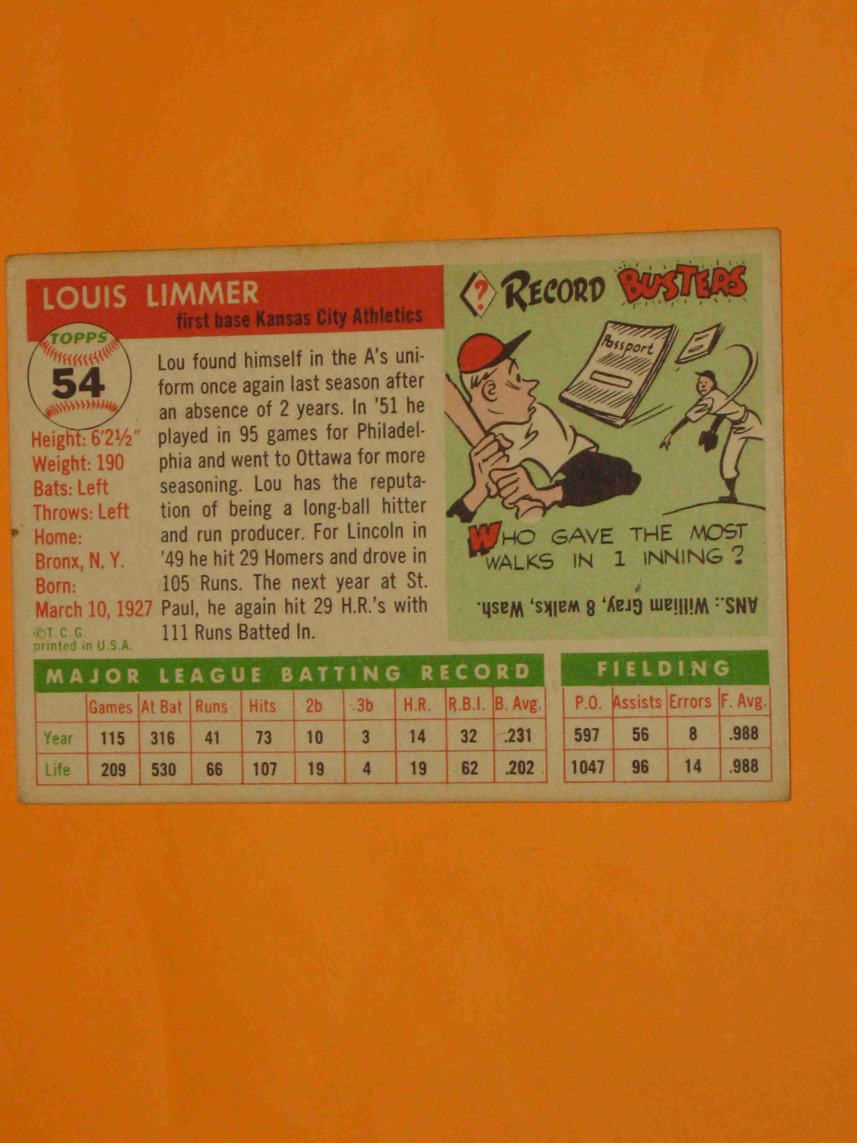 1955 Topps Lou Limmer #54 Kansas City Athletics