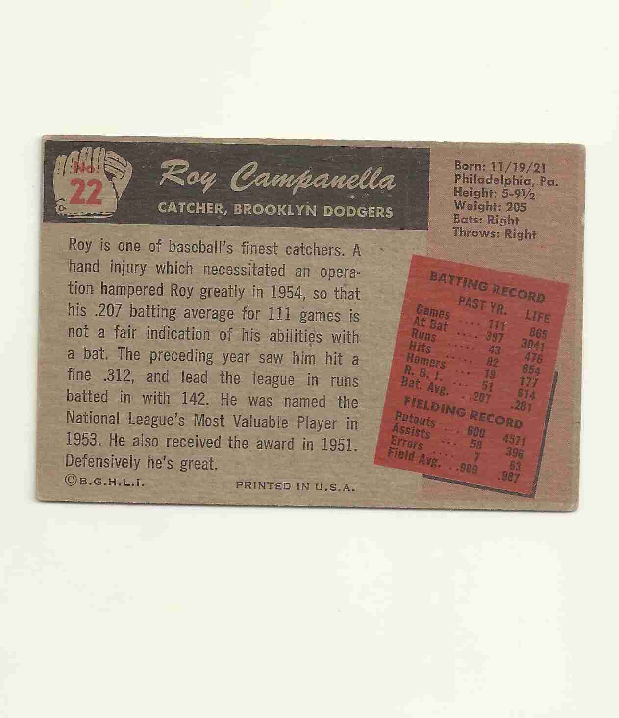 1955 BOWMAN #22 ROY CAMPANELLA DODGERS ROOKIE CARD