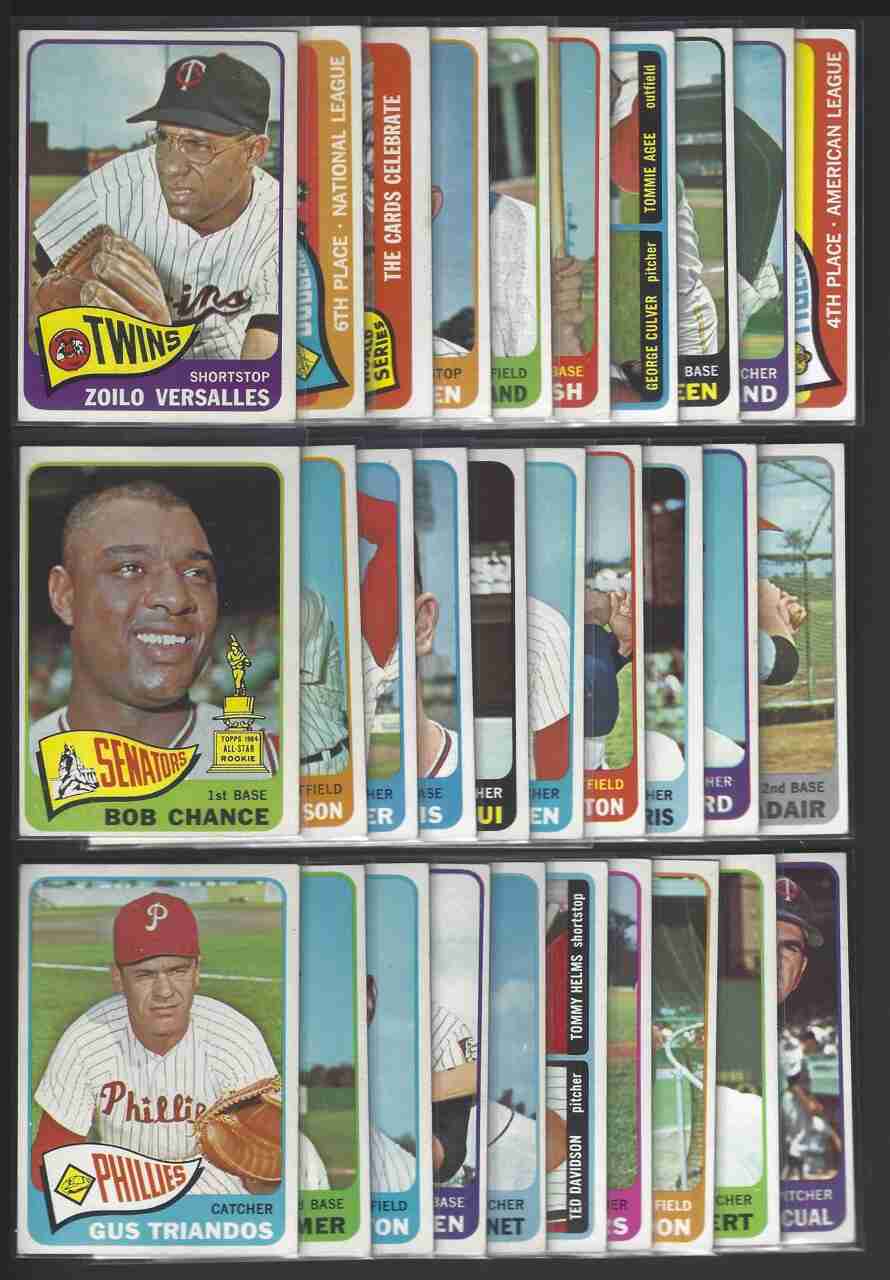 1965 Topps Baseball Lot (88) -Higher Grade-. No's-19,23,24,32,35,39,40,43,51, 52,54,56,63,71,75,76,77,82,89,92,94,106,108,113,116,117,121,122,124,126,139, 146,148,153,157,166,168,171,173,183,184,185,197,203,206,221,224,228,231,232, 233,235,237,242,243,246,247,248,252,255,258,259,262,263,265,266,271,274,279, 280,283,291,292,301,312,319,344,346,353. Hi No's-372,523,529,561,564,567,580, 585,597. Excellent large lot of 1965 Topps Baseball cards. Lot includes (9) Scarce High Numbers. This is a higher-grade lot. Cards have minor flaws - many with nice corners. Nice lot! Please review scans carefully for condition.