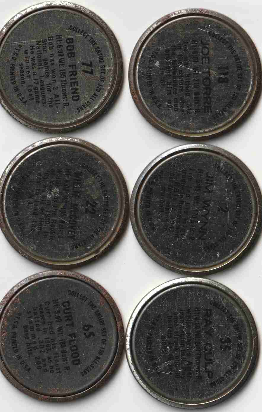 All coins have some mild wear on front and/or rim//Backs are legible but with some blemishes #2 Wynn Colt 45's #22 McCovey #35 Culp #65 Flood #72 Friend #118 Torre