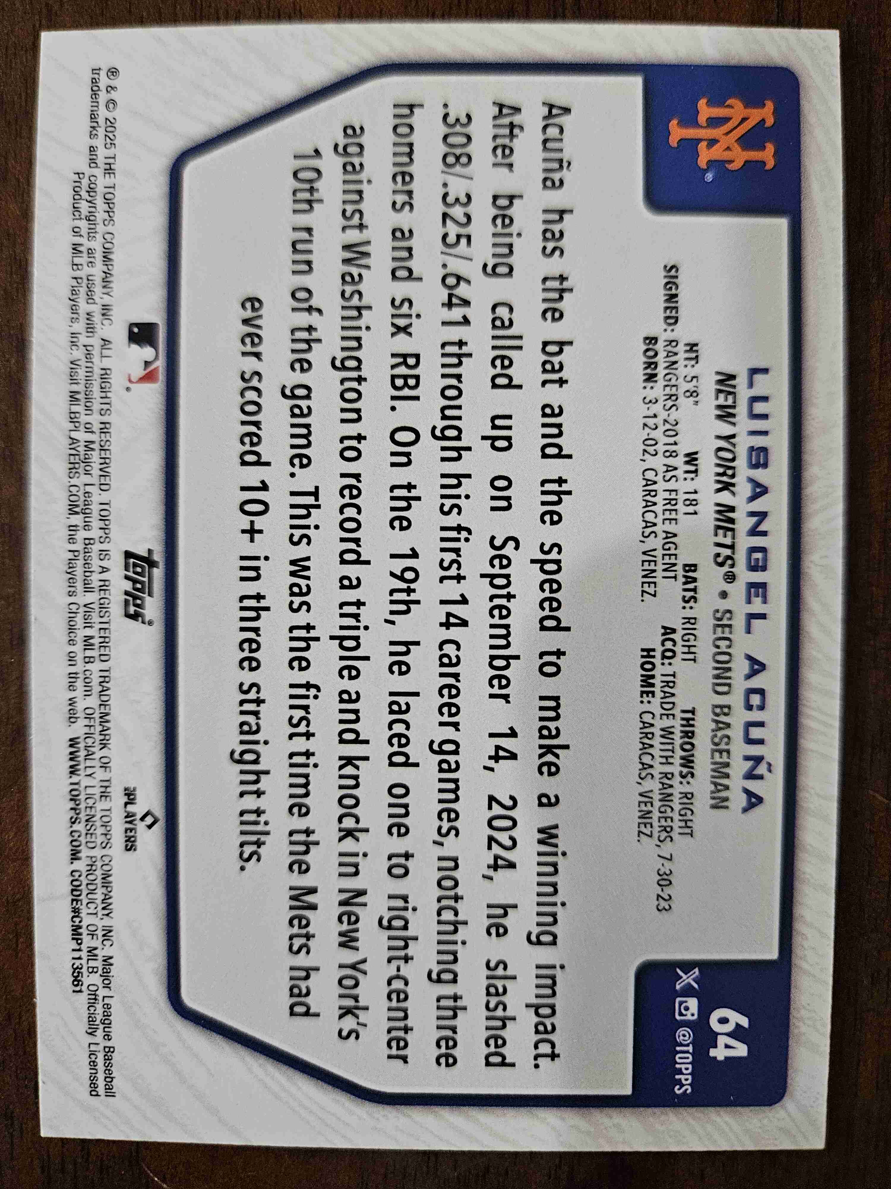 Luisangel Acuna 2025 Topps Costco Exclusive SP Rookie #64