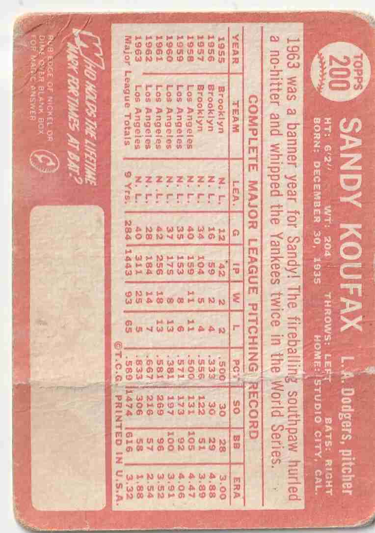1964 Topps #200 Sandy Koufax LA Dodgers (lower grade)