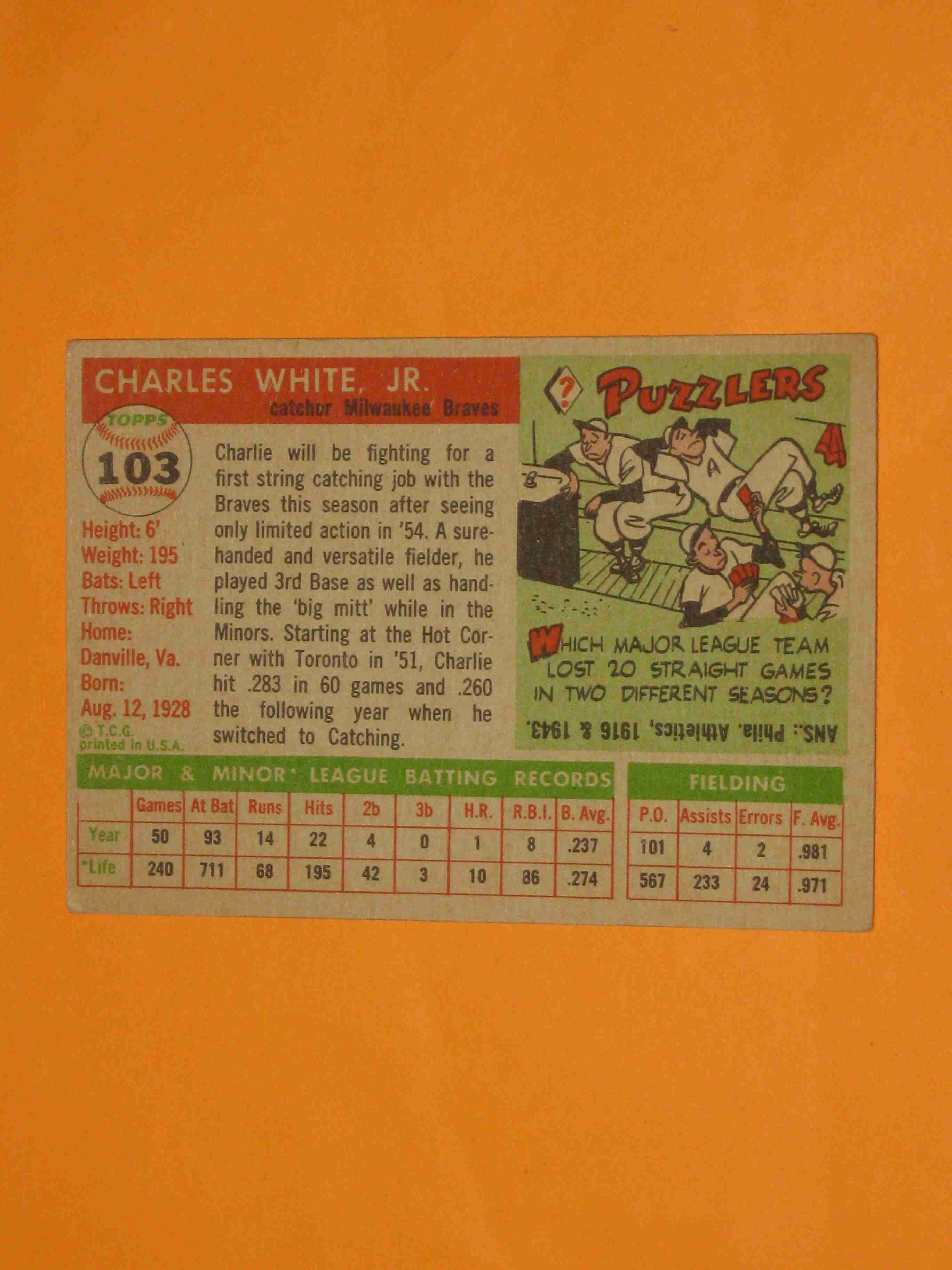 1955 Topps Charlie White #103 Milwaukee Braves