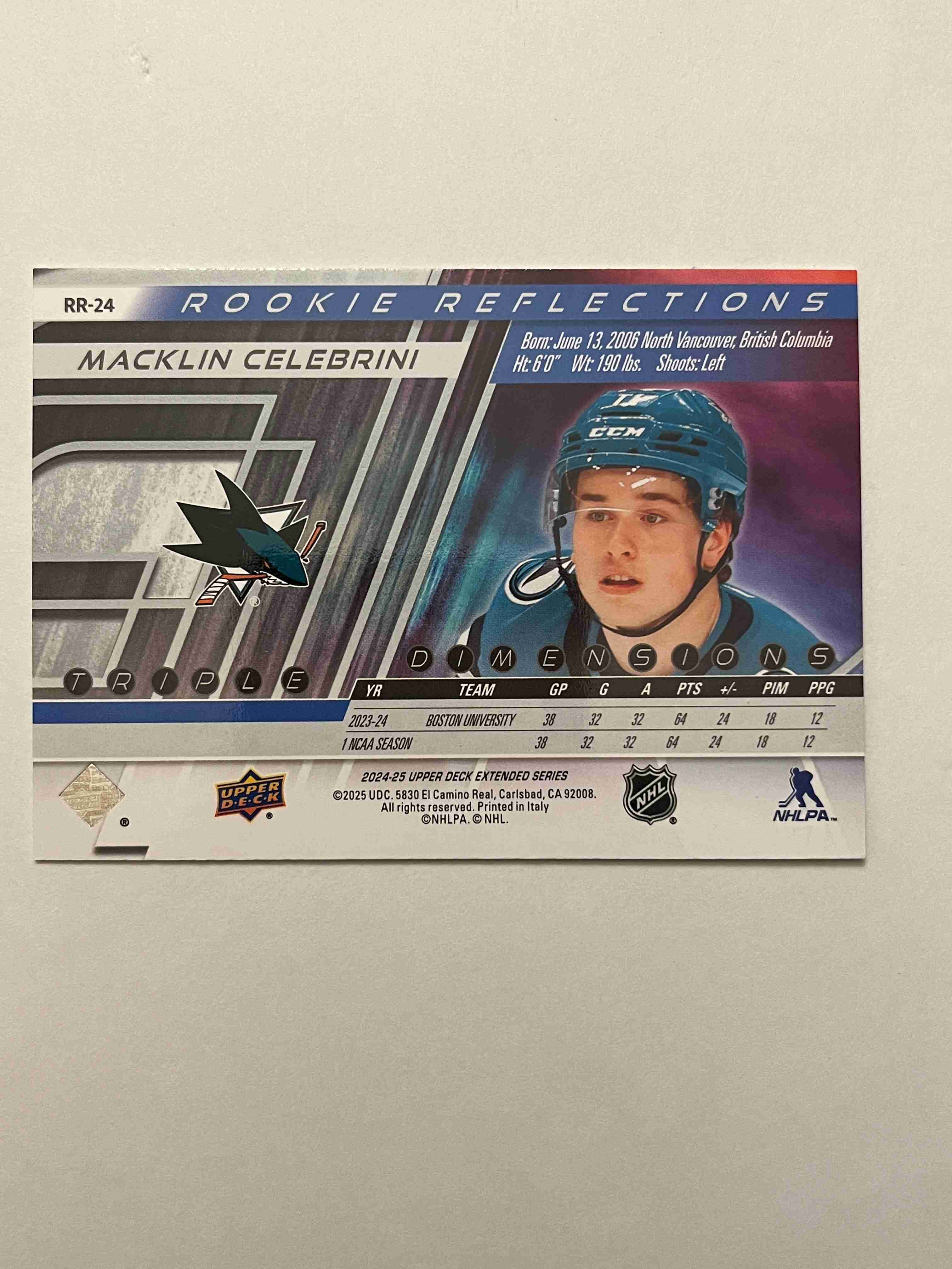 Macklin Celebrini 2024-25 UD Extended Rookie Reflections