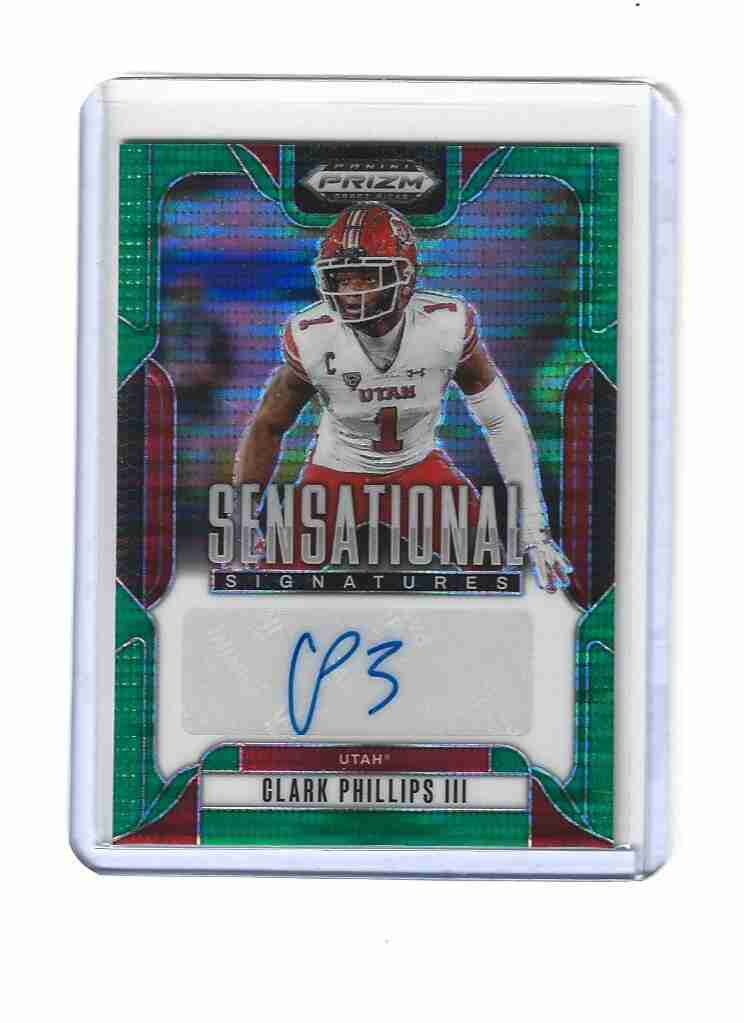 2025 Panini Prizm Draft Picks Sensational Signatures Clark Phillips III GREEN PRIZM AUTO ROOKIE #SS-CPS. Card is numbered on back #16/25.
