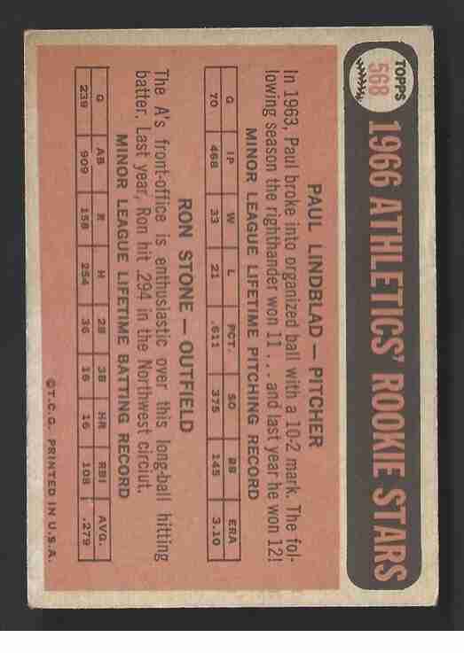 1966 Topps Rookie Stars (Hi No.) -#568- A's. Scarce high number. This card is in the mid to higher-grade range. Card has minor flaws - light corner wear. Nice shape for this era. Ships no tracking. Please review scans carefully for condition.