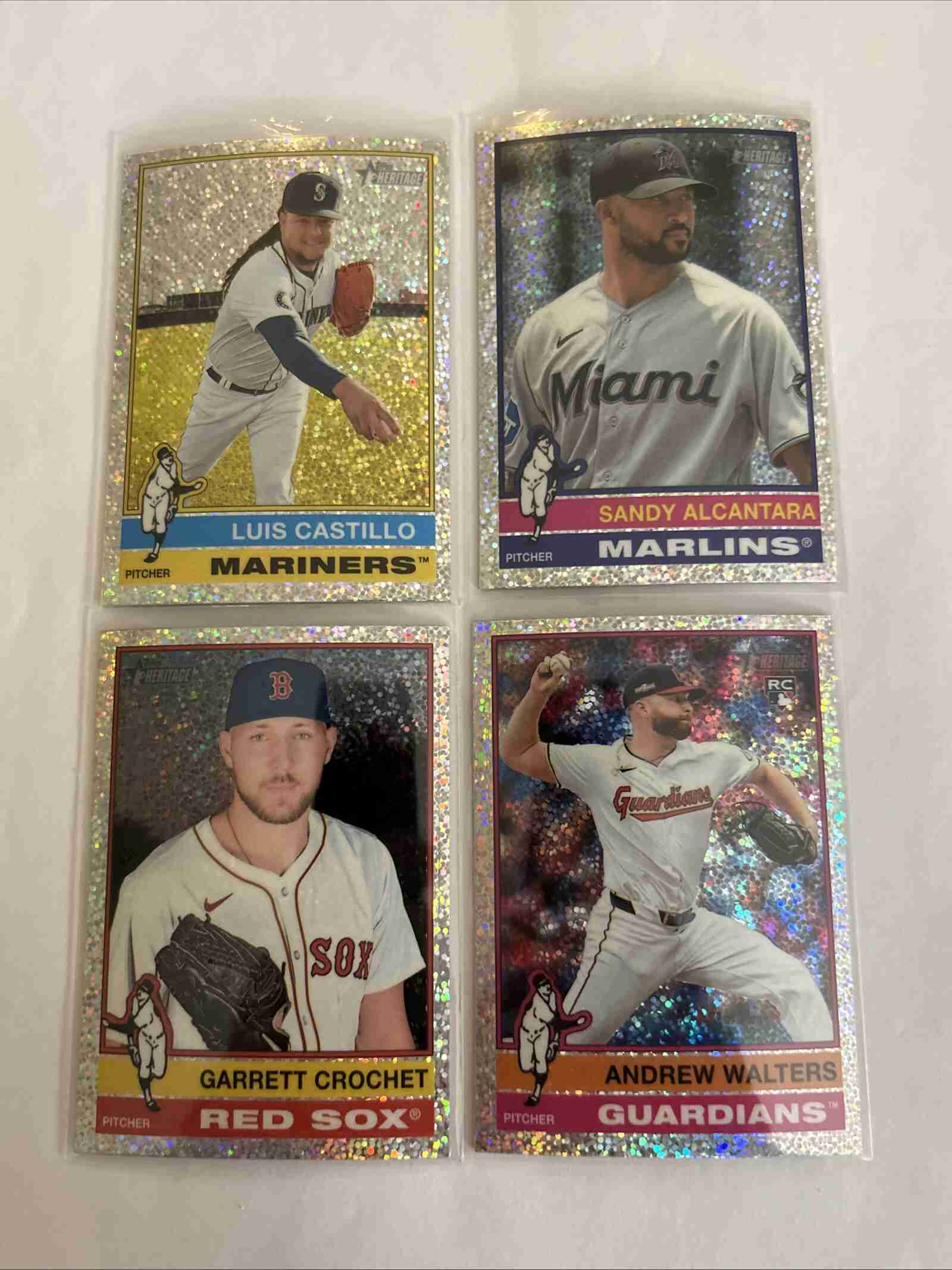 The items up for bid is a lot of 4 Topps Heritage baseball silver sparkle cards. The cards featured are Garrett Crochet (Red Sox), Andrew Walters (Guardians), Sandy Alcantara (Marlins) and Luis Castillo (Mariners).