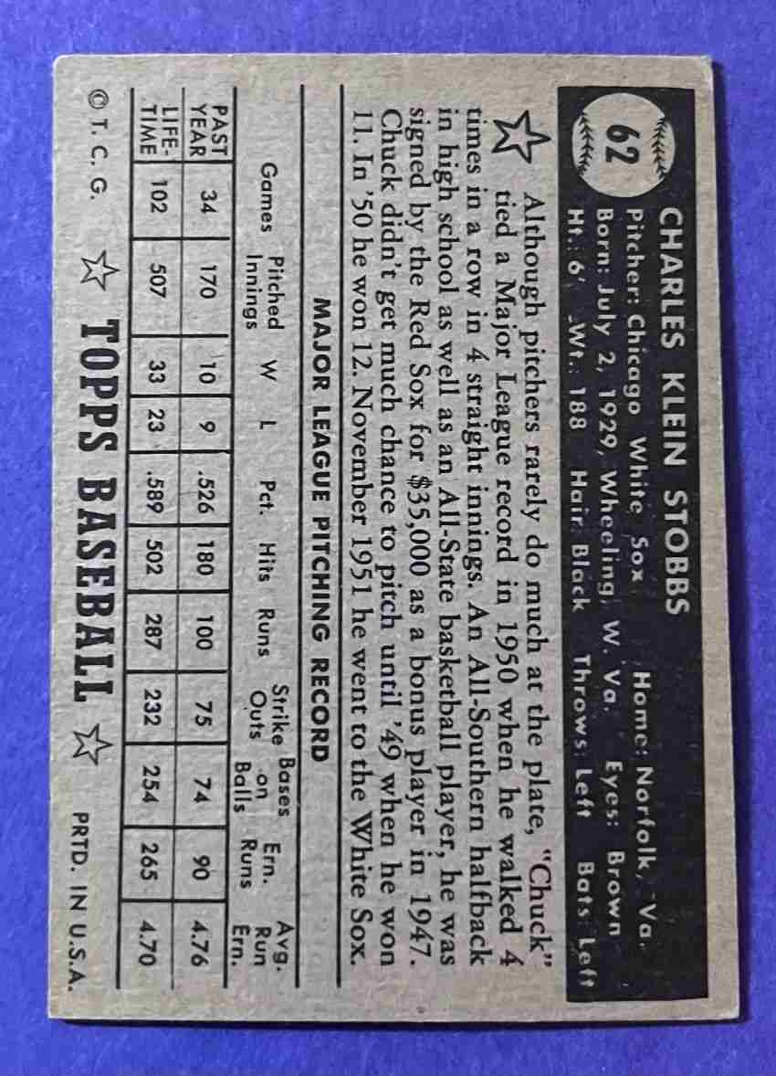 52 Topps CHUCK STOBBS RC Lo #62 +++