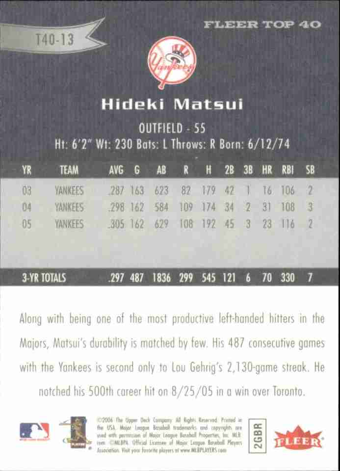 2006 Fleer Top 40 #T40-13 Hideki Matsui New York Yankees