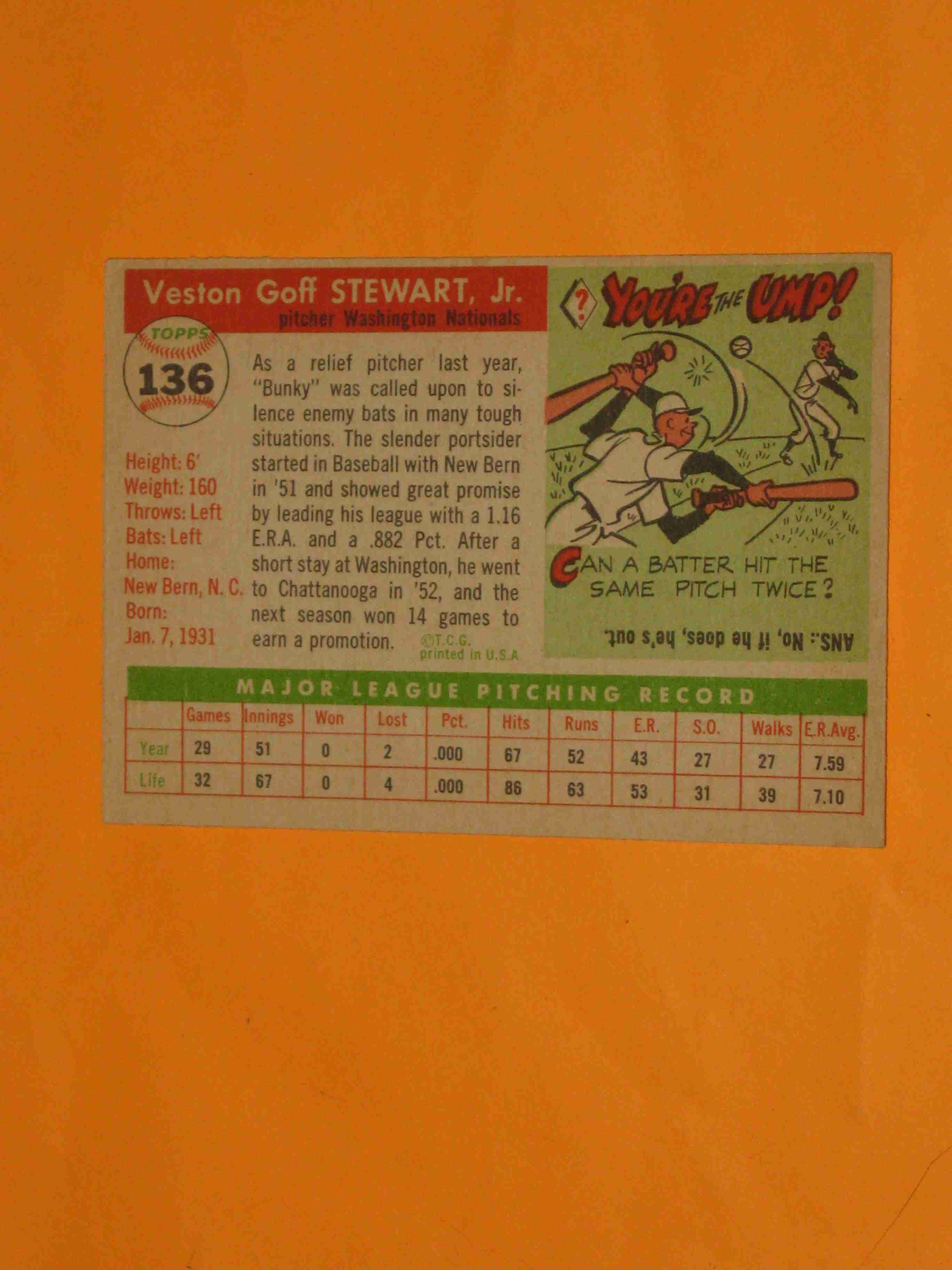 1955 Topps Bunky Stewart #136 Washington Nationals NICE