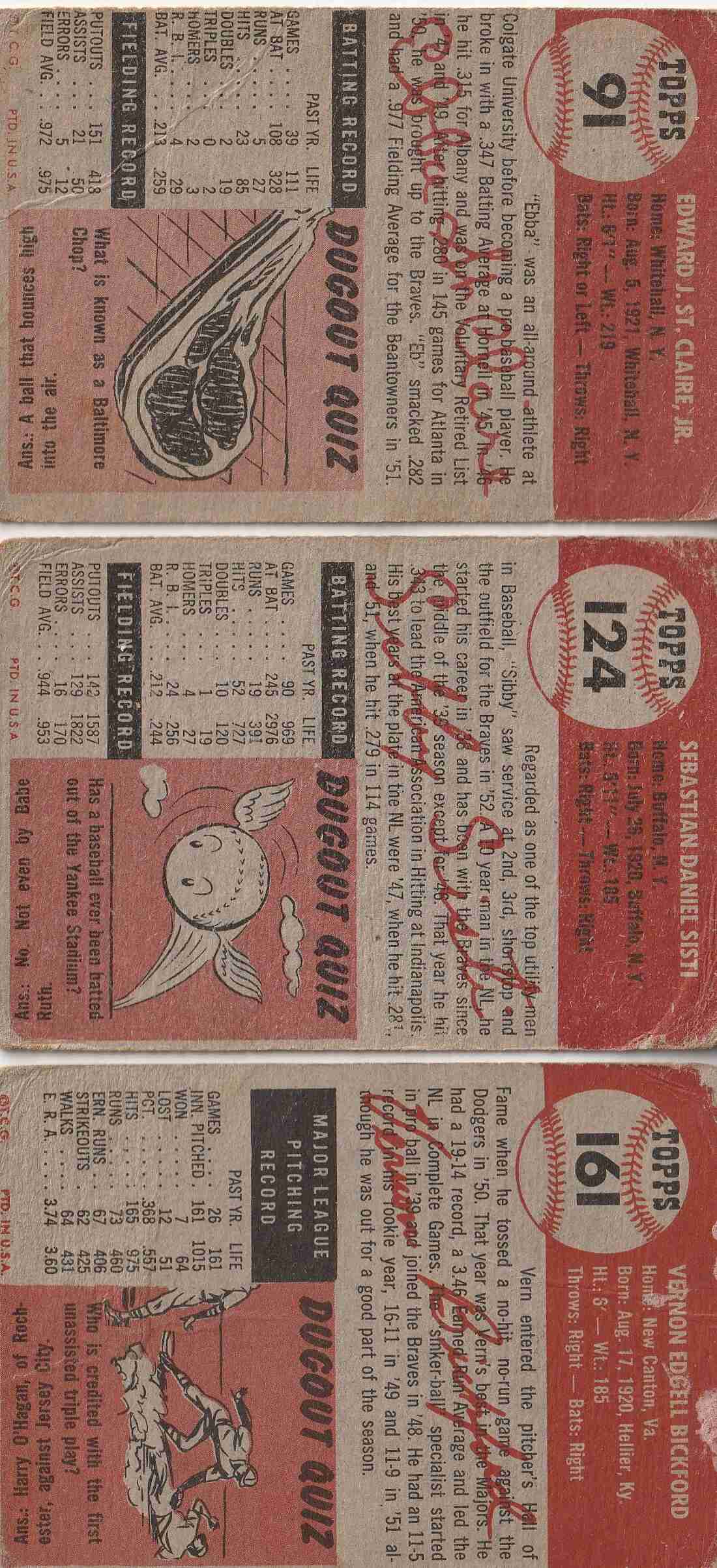 #91 Ebba St.Claire #124 Sibby Sisti #161 Vern Bickford condition-**lower grade** intact with multiple blemishes