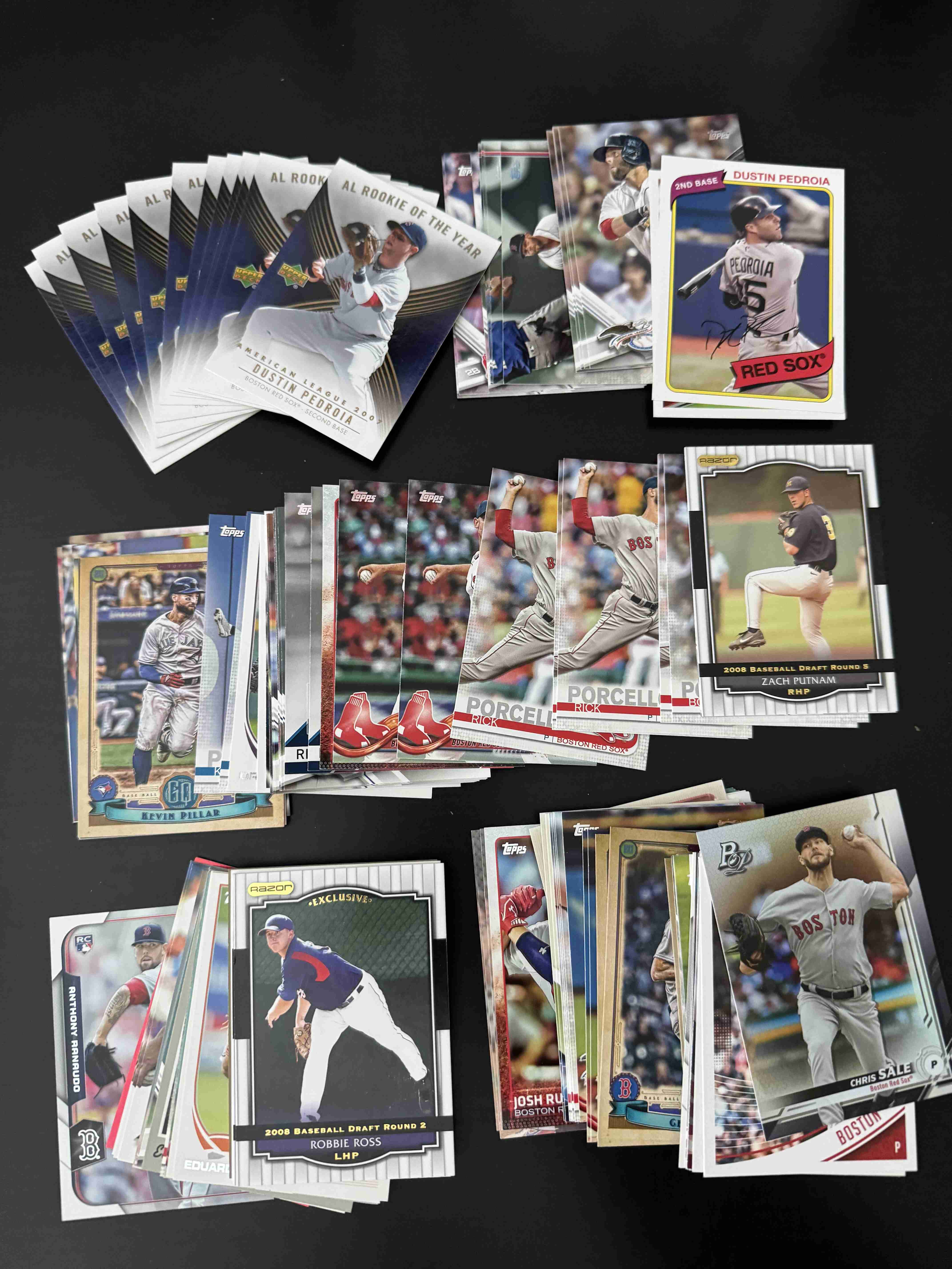 This is a large lot of baseball cards featuring players associated with the Boston Red Sox franchise. Great lot for team collectors or card dealers/resellers.