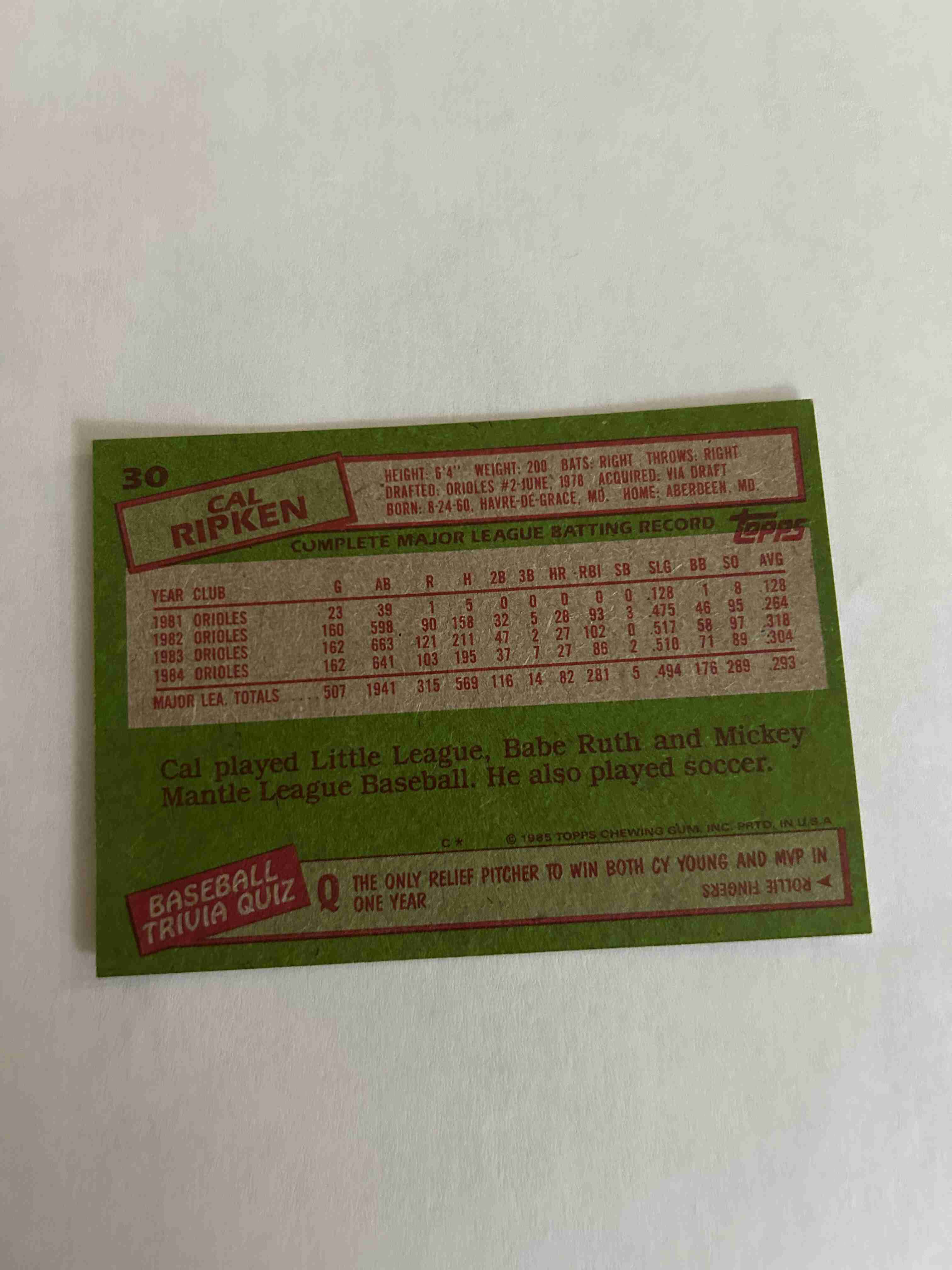 The card up for bid is a 1985 Topps Baseball Cal Ripken #30. Please look at the photos for card condition.