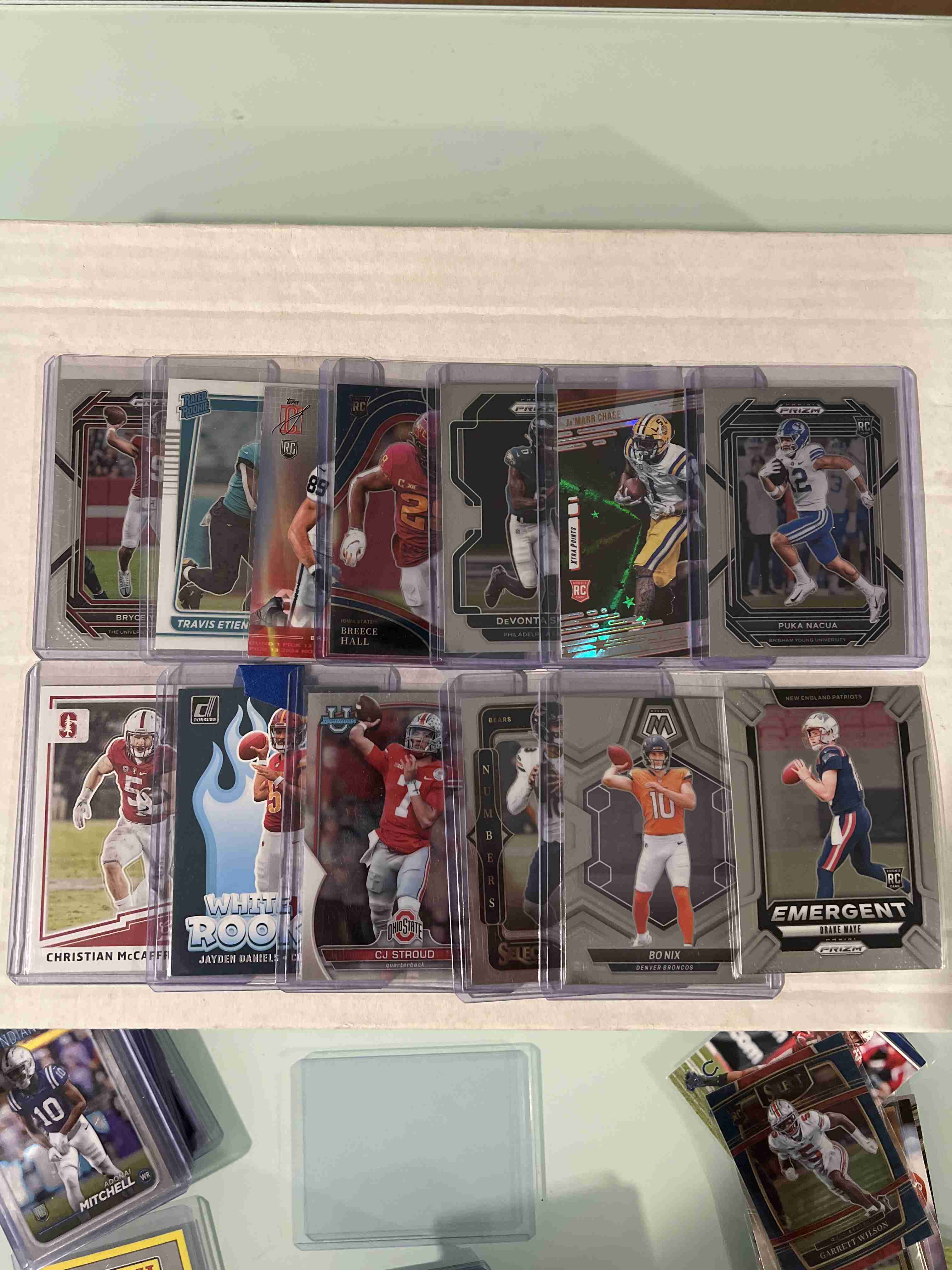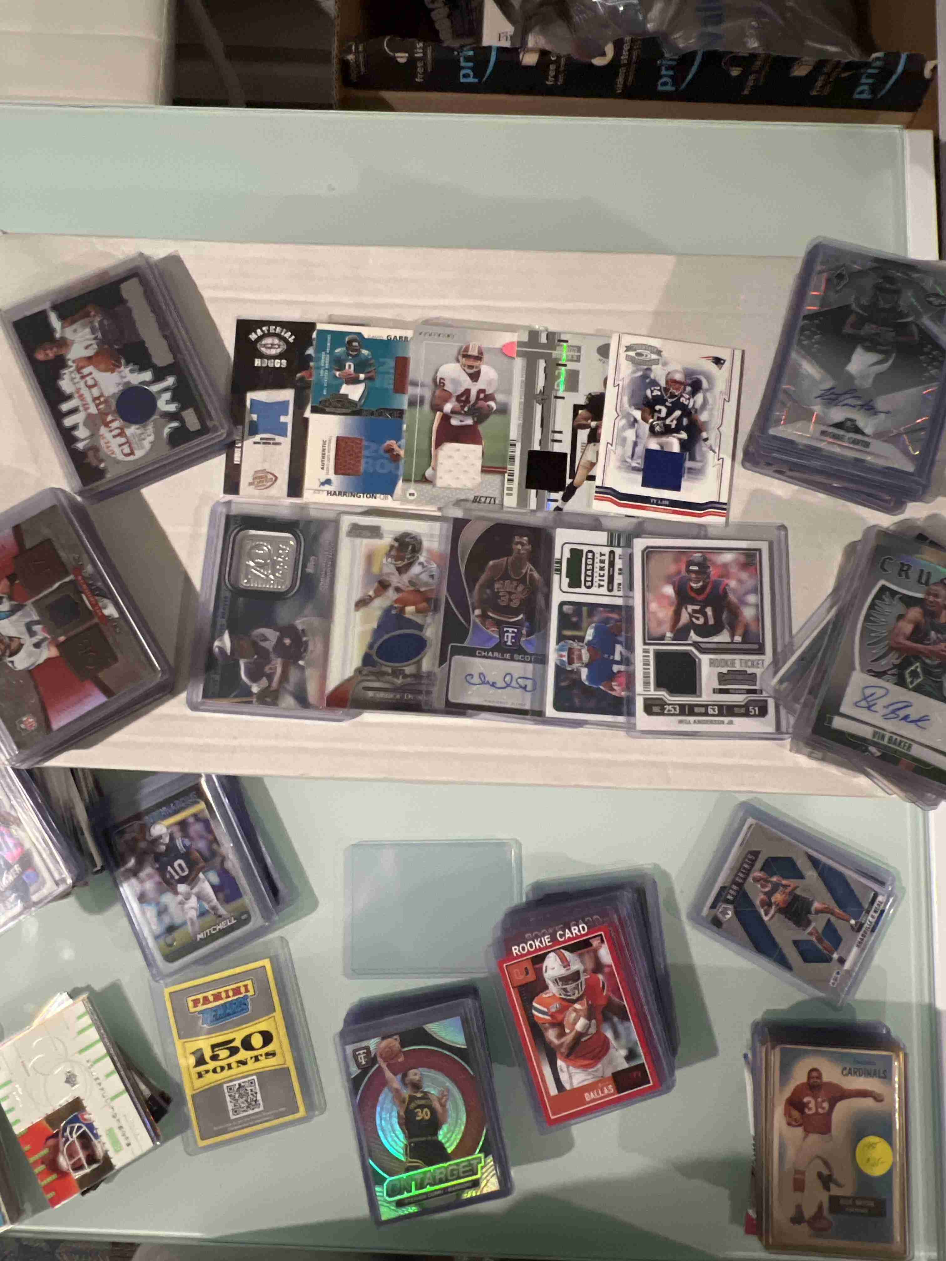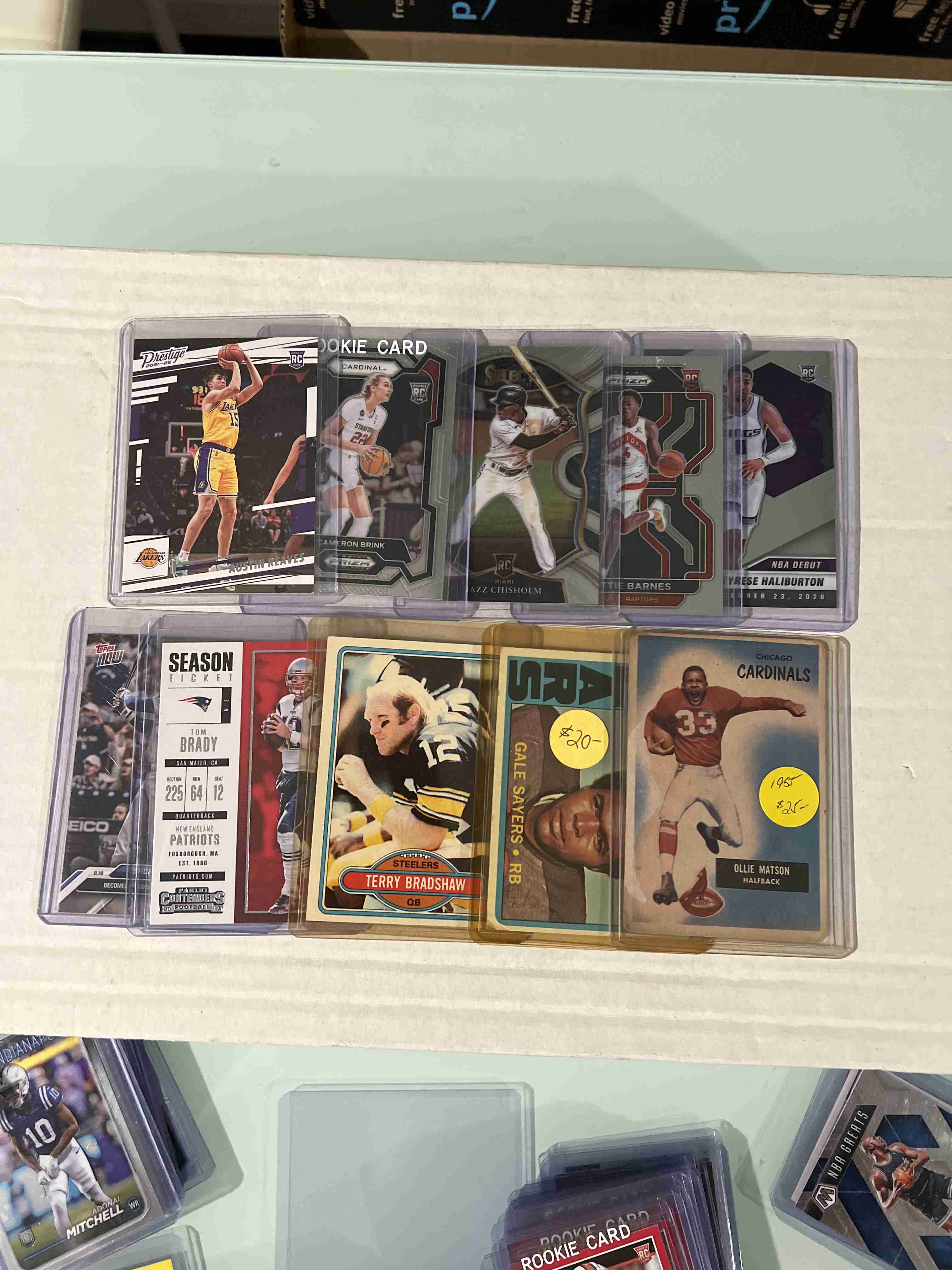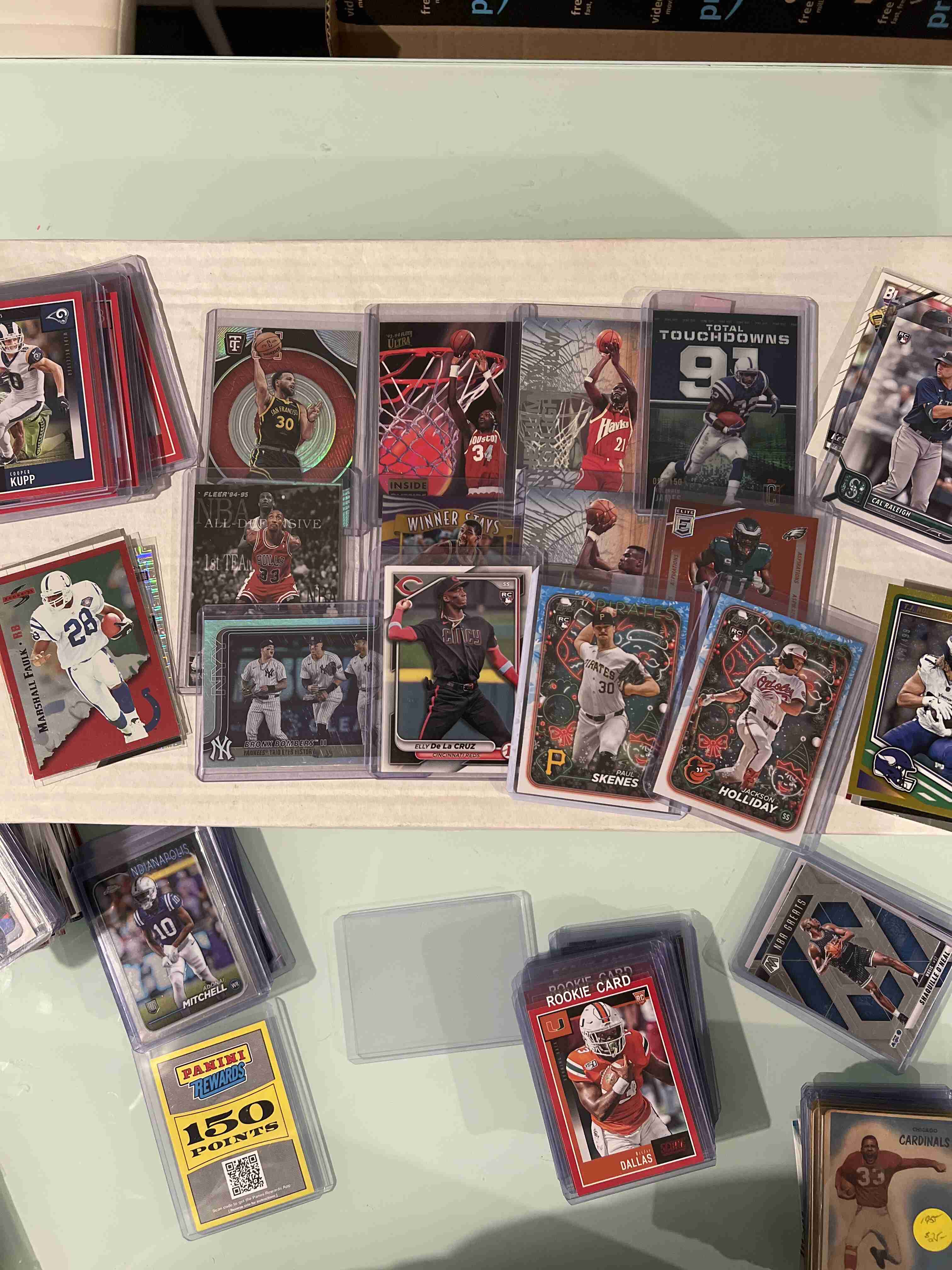 Everything pictured plus everything thing in the 3-row box you'll receive if you're the winning bidder... some things in here are jersey cards RC's inserts, #ED,auto's on card and in person, vintage cards... players like Paul Skenes, Elly, Curry, Maye, Stroud, Nix, LeBronJames, Aaron Judge.... and many others...I didn't have enough room for all the pics.