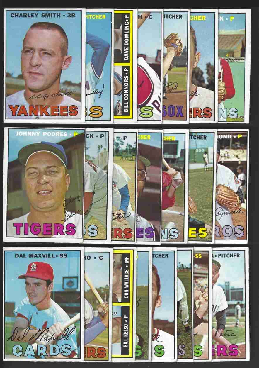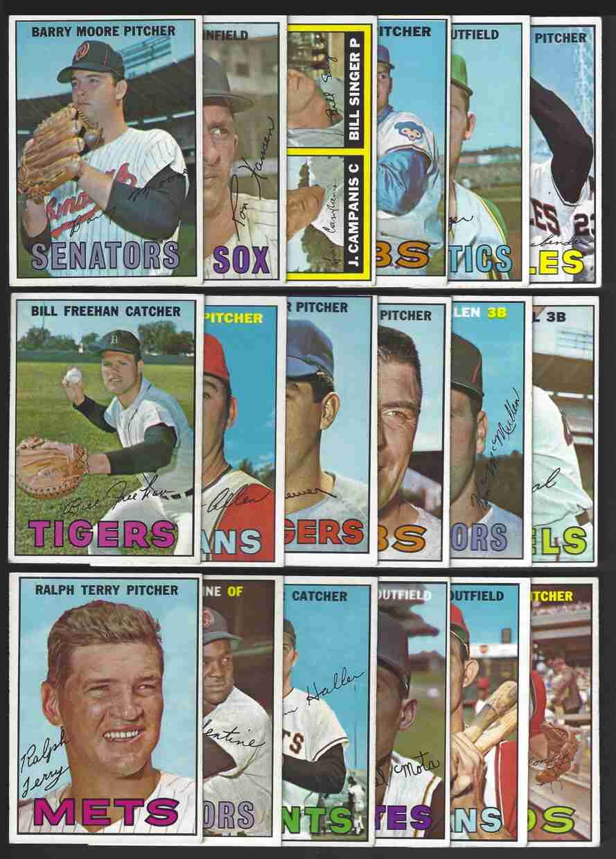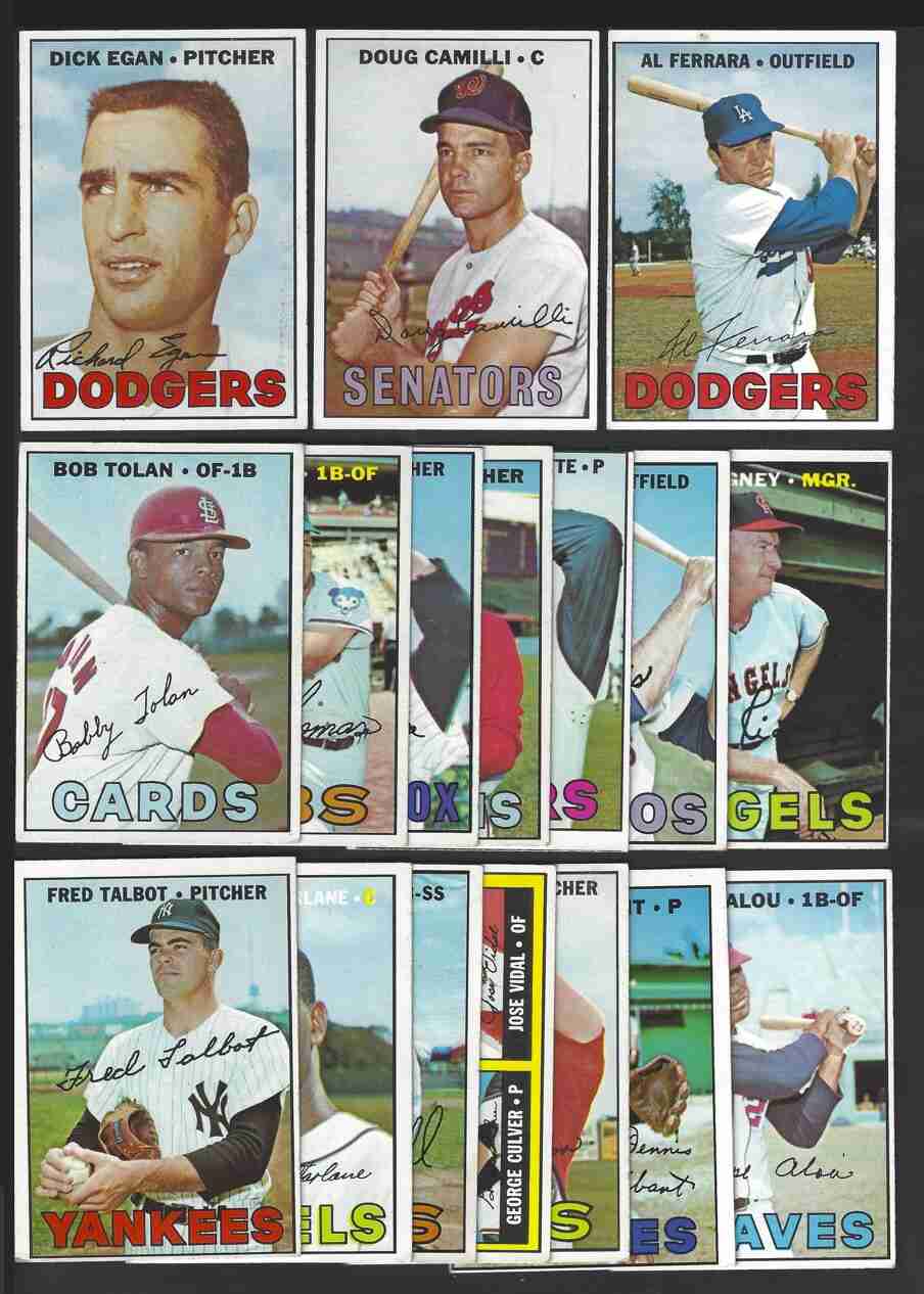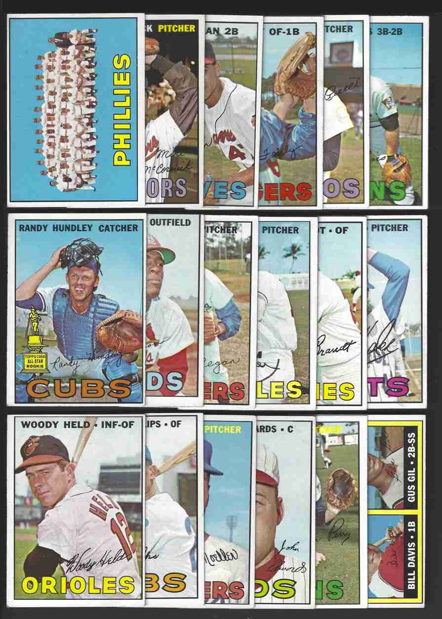 1967 Topps Baseball Lot (75) -Higher Grade-. No's-9,11,12,16,17,22,24,31,39, 47,48,58,59,64,65,66,69,80,86,89,94,97,98,102,106,108,130,141,142,144,148, 149,202,246,251,253,256,257,272,284,292,310,313,316,324,330,335,336,345,364, 365,367,368,380,403,421,441,449. (14) Semi-Hi No's-458,467,474,479,482,483,
