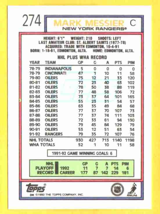 Mark Messier #274 1992 Topps